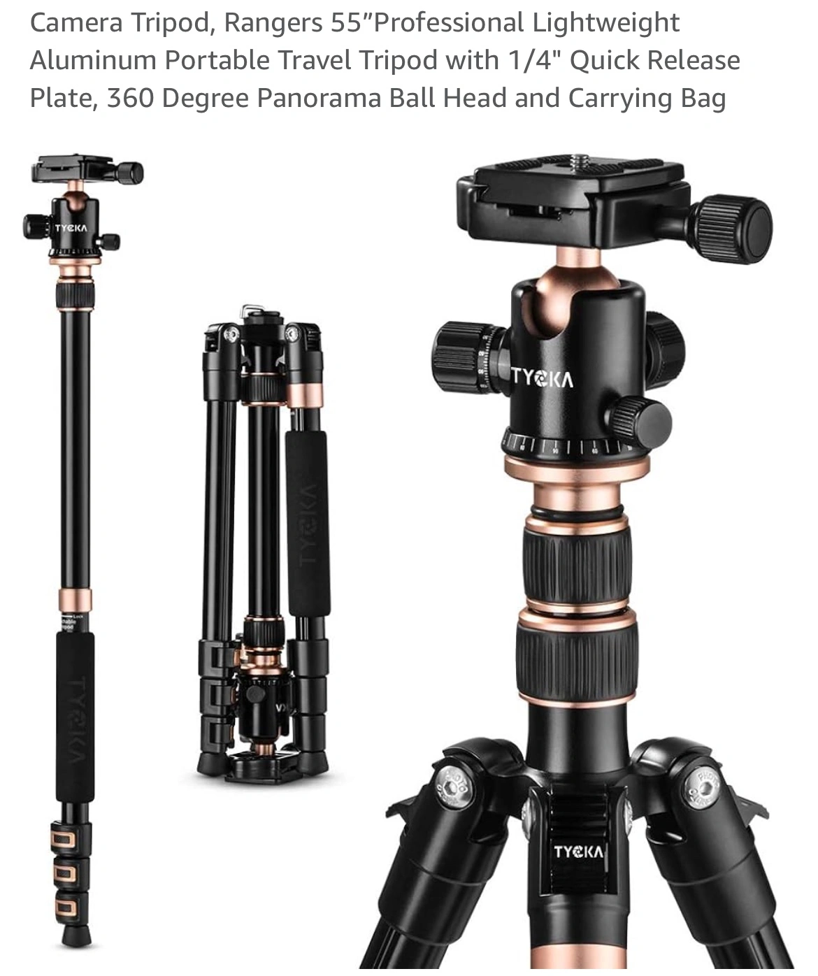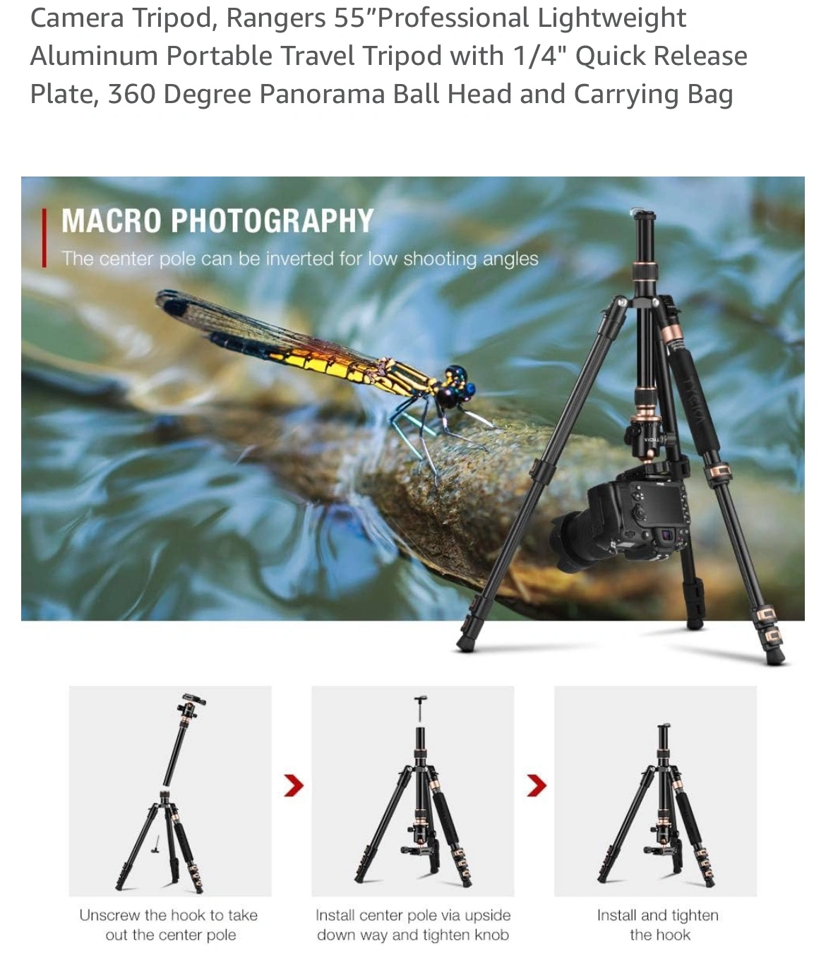 Rangers 55” Professional Lightweight Aluminum Portable Travel Tripod with 1/4 Quick Release Plate, 360 degree Panorama Ball Head and Carrying Bag
