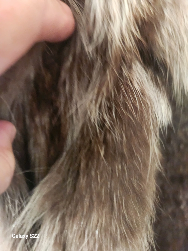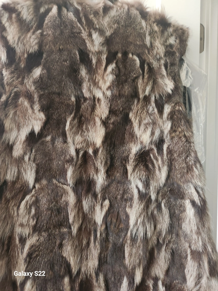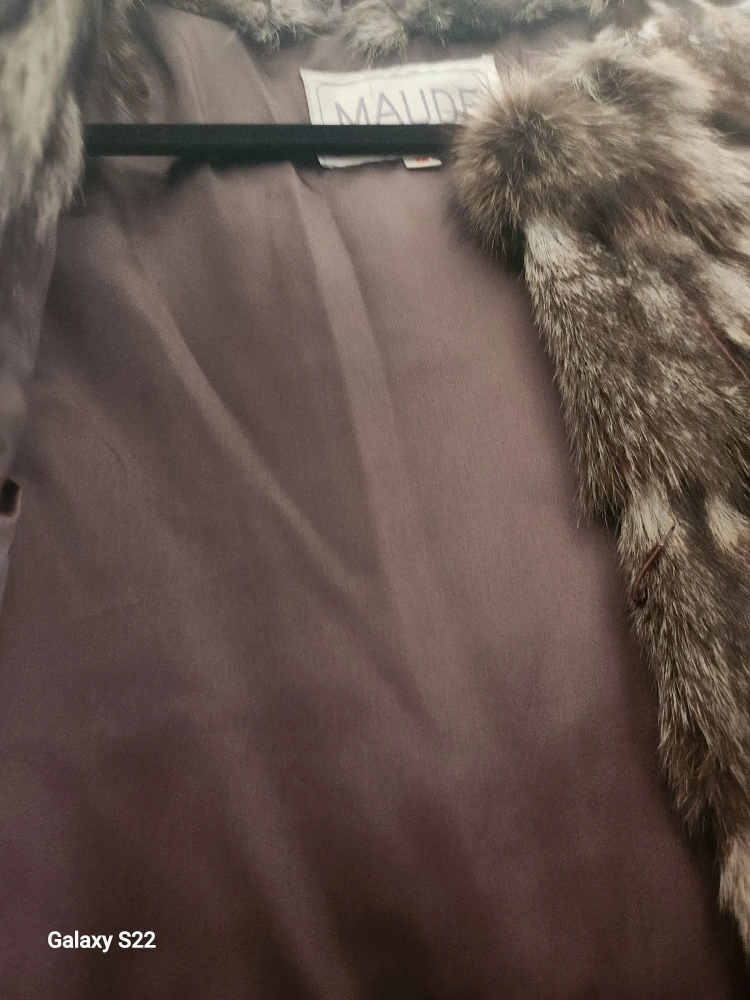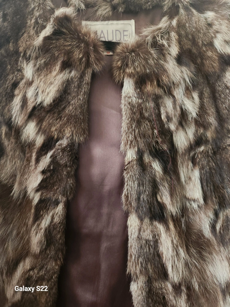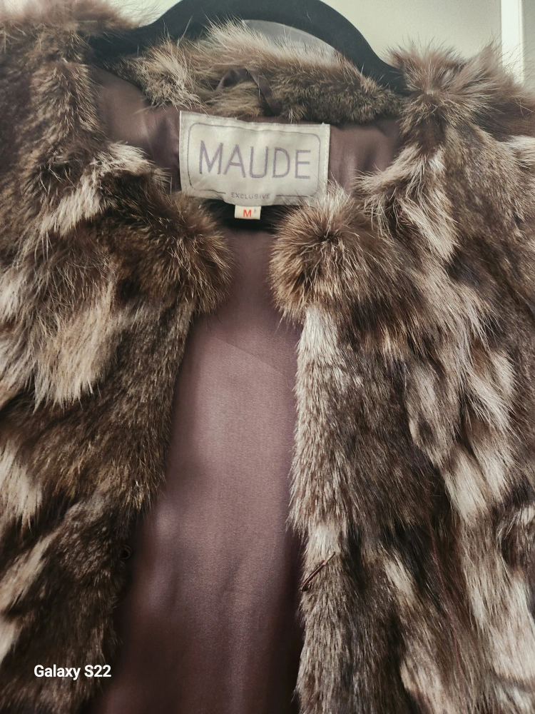 This is a brown and white fur jacket with a label that reads "Maude". It is size medium sleeveless. The jacket is in good condition and has been stored indoors. The fur is soft and luxurious. There are no visible flaws or tears. It has side pockets and does up inside with hooks.