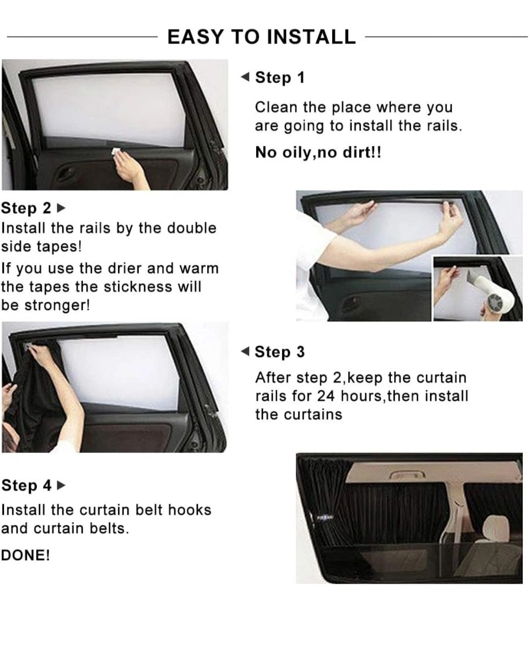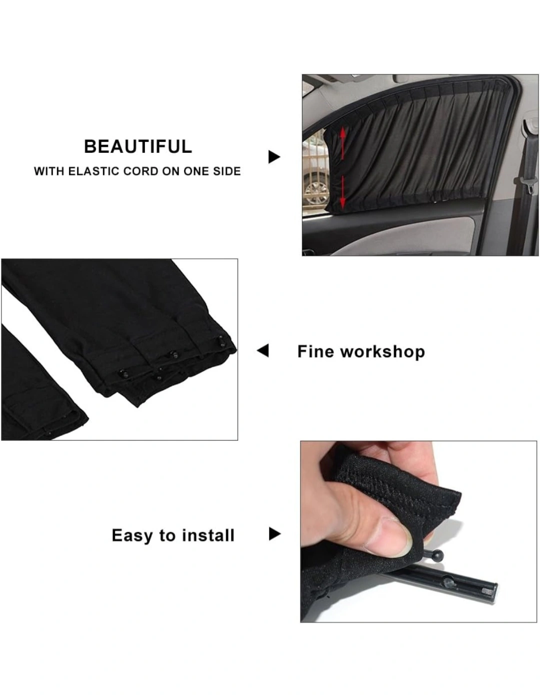 New Description: This Car Window Curtain is made of high quality anti- cloth, heat insulation and sunshade, it can effectively keep car interior temperature. Moreover, it can protect your privacy inside the vehicle. With it's skillfully manufacture and beautiful design, enhance the VIP style for your car, elegant and fashionable. Easy to install and universal for most of cars. Such a great curtain! What are your hesitating for? Features: 1. High quality cloth, effectively keep car interior temperature, heat insulation and avoid overheat from the sun exposure with long time. 2. Provide better privacy inside the vehicle. 3. Anti- and safety, there is no harm to window glass lift after stick the rails well. Specifications: Material: Cloth Color: Beige, Gray, Black, Black Mesh(Optional) Model: 50S Size(L x W): 51 x 38cm/20.08" x 14.97" Package Included: 2 x Car Curtains 4 x Plastic Rails 6 x Rail Bolts 2 x Hook and Loops 2 x Bandage Hasps Installation and Notes: 1. Please clean the place where you are going to install the rails. No oily! No dirt! 2. Install the rails by the double side tapes. Note: Recommend you use drier and warm the double side tapes, the stick of the tape will be stronger! Also you can fixed with cord. 3. Keep the curtain rails for some hours and install the curtains. Note: If curtain size is wrong, please replace the rails. Recommend you clear the adhesive with scavenger, and install new rails. 4. After all installed well, please remember plug the bolts. 5. Please pay attention to the position before installation! 6. The front curtain should not cover the rear-view mirror to avoid accidents. 7. Recommend you open the window when installing. 8. Please roll the window down when installing. Please checkout my other ads for more great deals. I am posting new items daily. Tyvm πŸ™‚