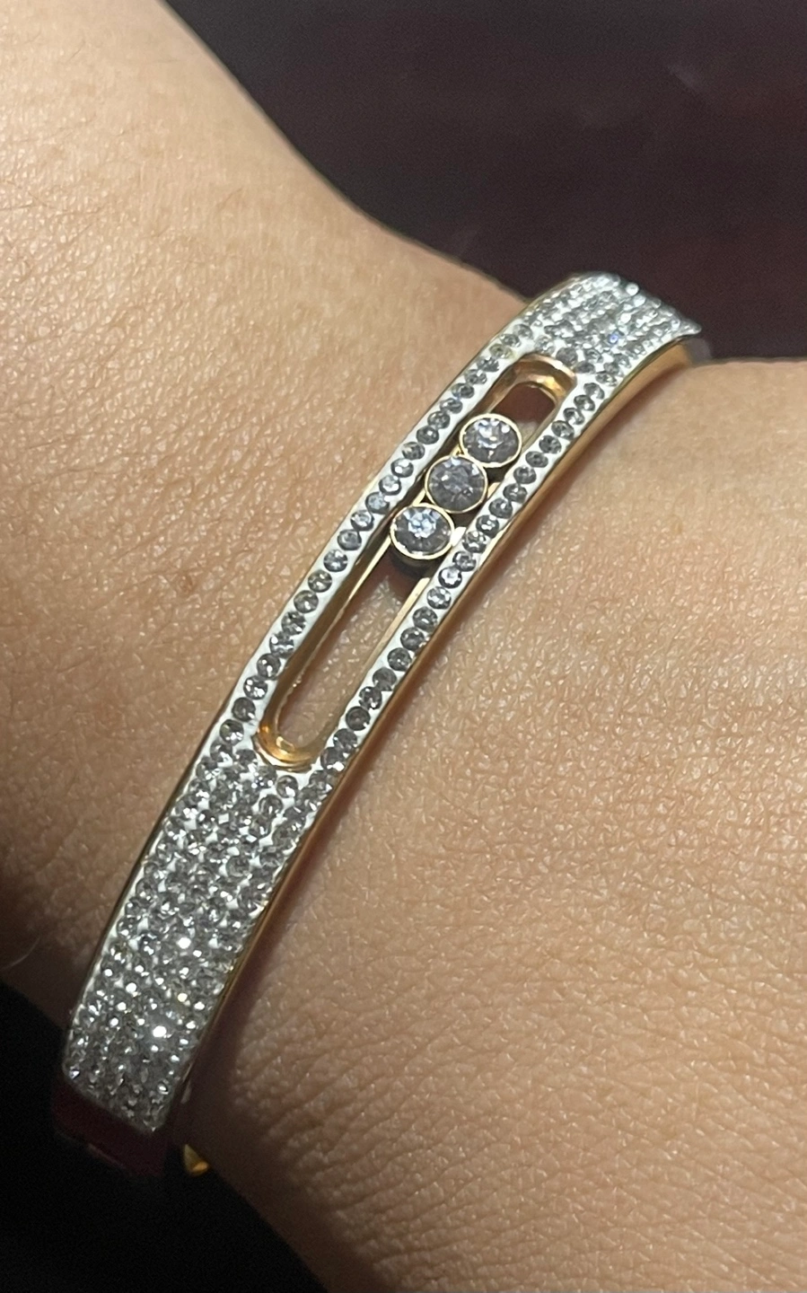 Item description: Gold w/ crystal design on front. 3 Floating diamonds that move. Can open for ease of wear and to put on and take off. A beautiful and classic piece that would add elegance to an outfit. If Interested please feel free to message me. Thanks.