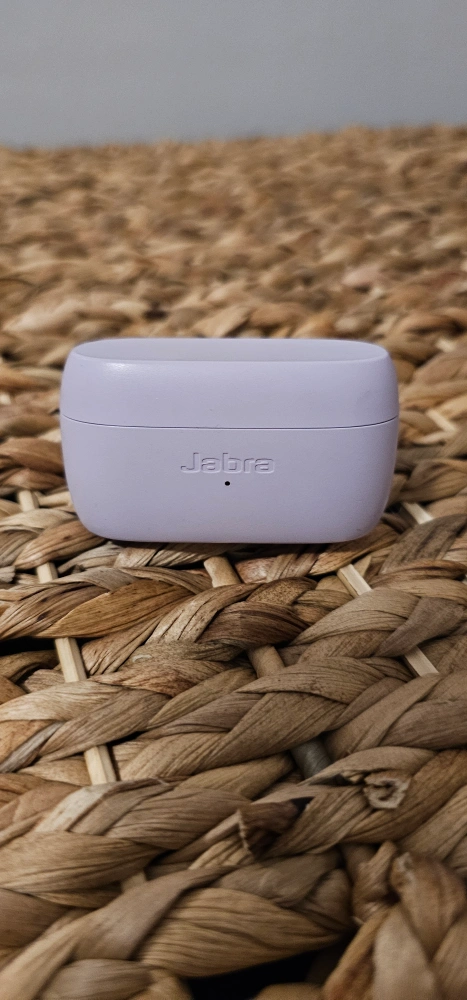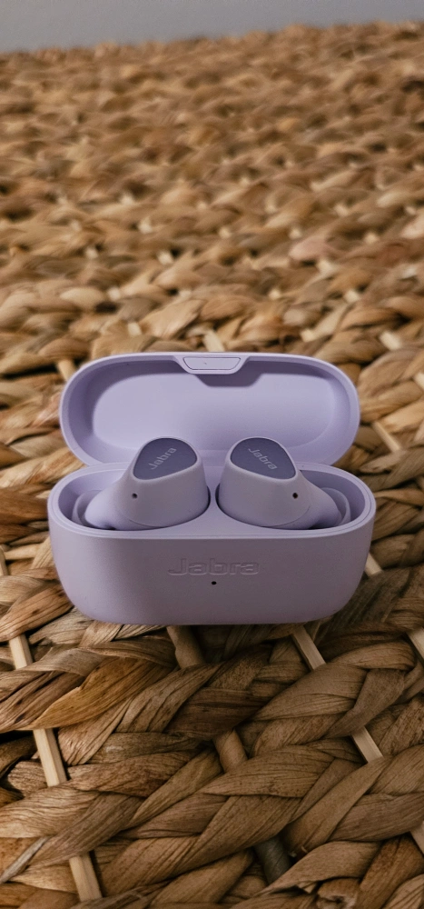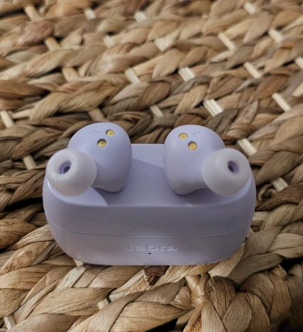 Lilac Jabra Elite 4 Wireless headphones with case.