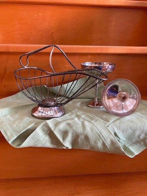 A silver plated brass wine holder and silver plated wine or champagne goblets. Made in Italy. Selling all three items together or separately. All together is $30 as a bundle. Unbundled $20 for the goblets and $20 for the wine holder basket. All is excellent condition but wine holder can use a polish. From a smoke and pet free home. Pickup only in the St. Lawrence market area of downtown Toronto. Cash only.