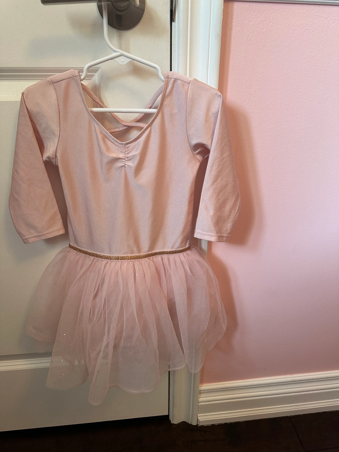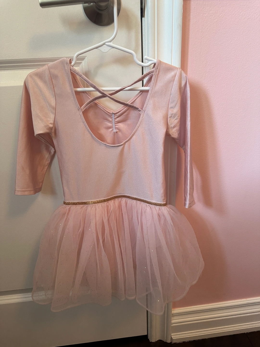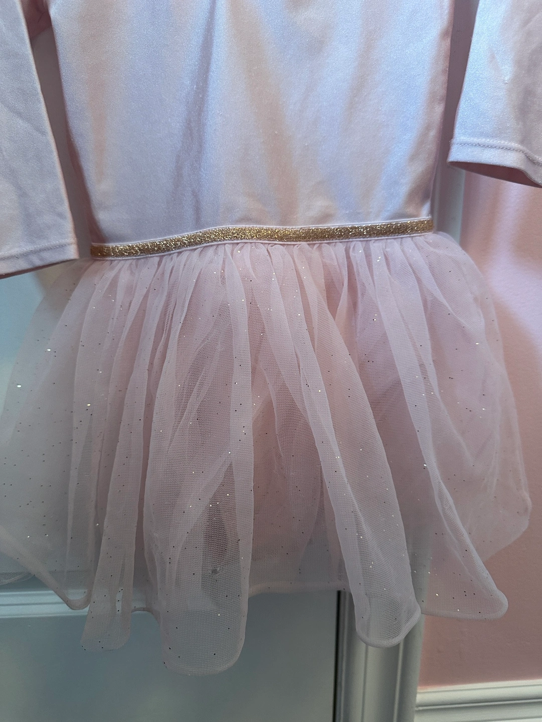 Excellent condition. Light Pink Dance Leotard in shiny jersey with crossover straps at back and 3/4 lenght sleeves. Glittery elasticized waistband and a double layered skirt in glittery tulle. Size: 4-6. Fits a 3 year old (smaller make)