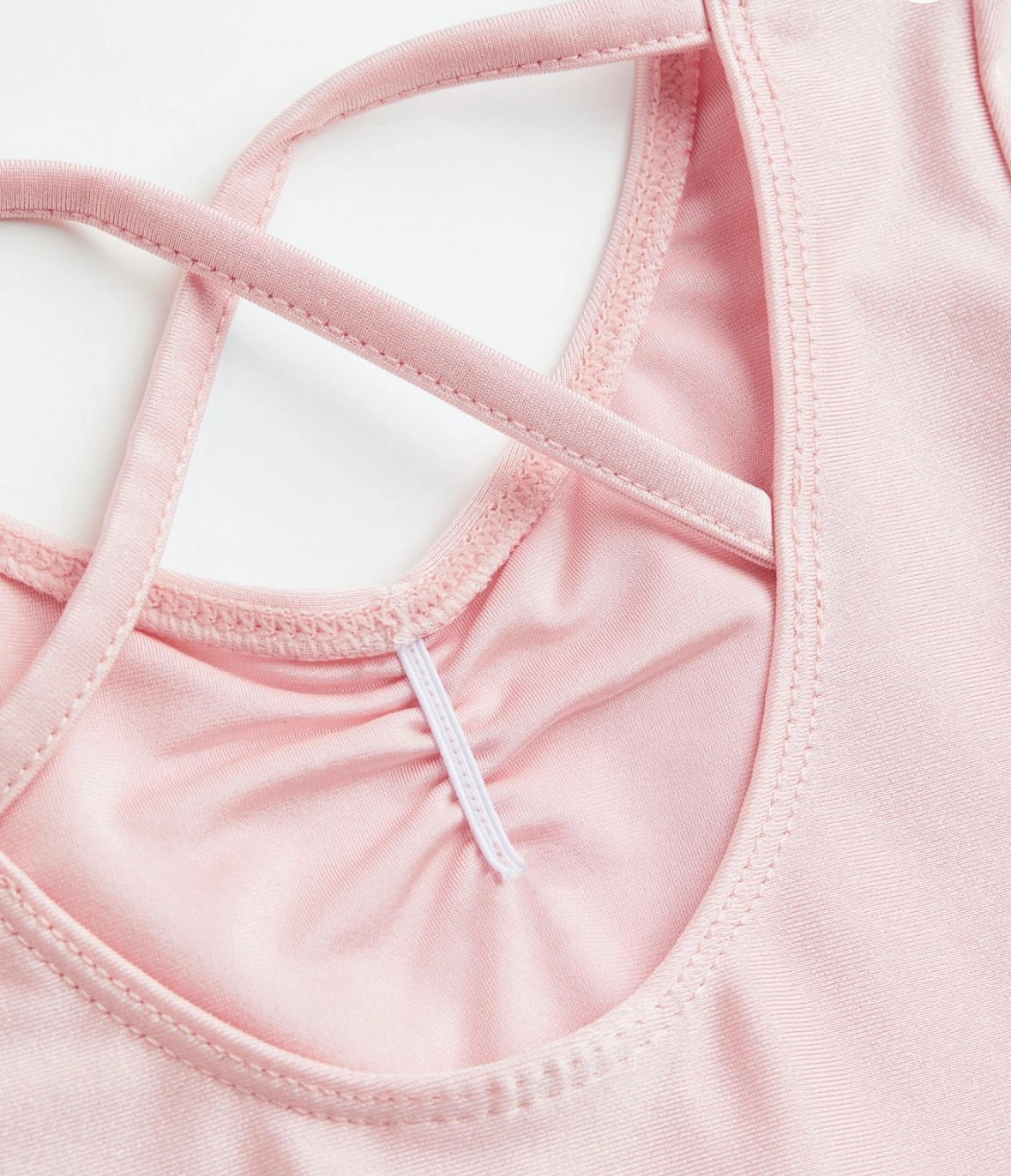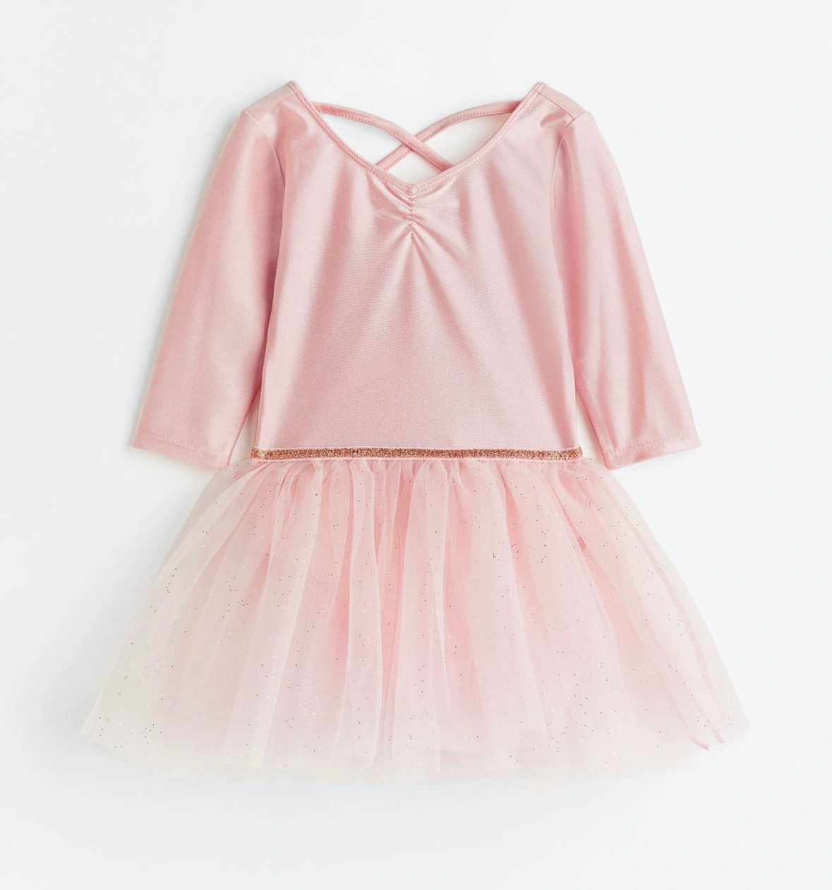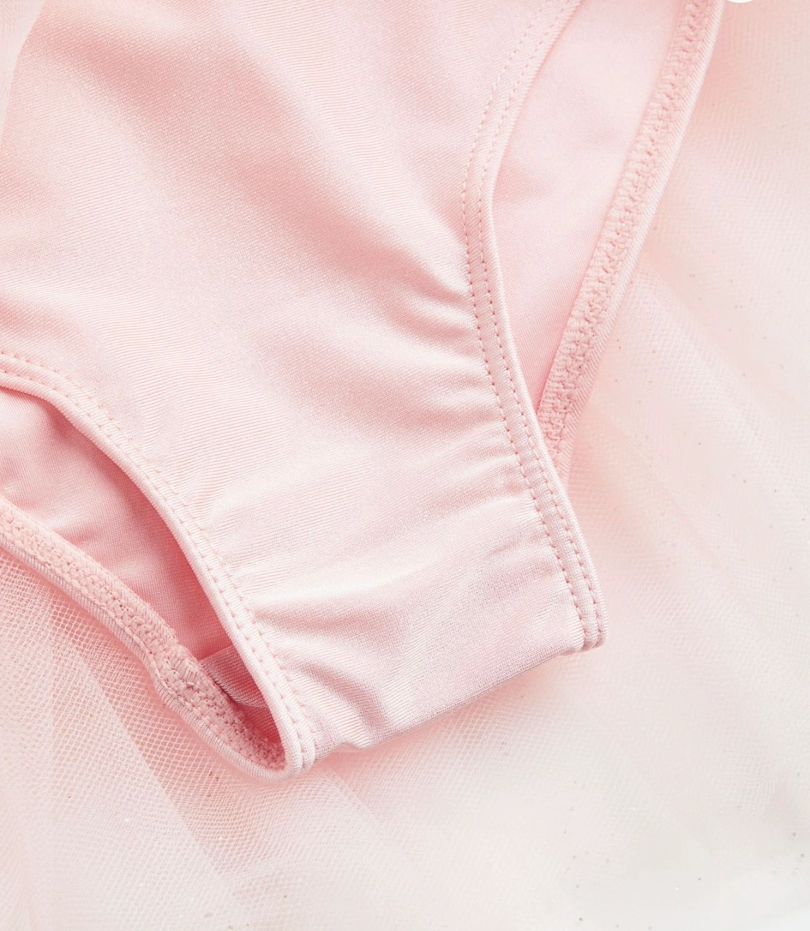 Excellent condition. Light Pink Dance Leotard in shiny jersey with crossover straps at back and 3/4 lenght sleeves. Glittery elasticized waistband and a double layered skirt in glittery tulle. Size: 4-6. Fits a 3 year old (smaller make)