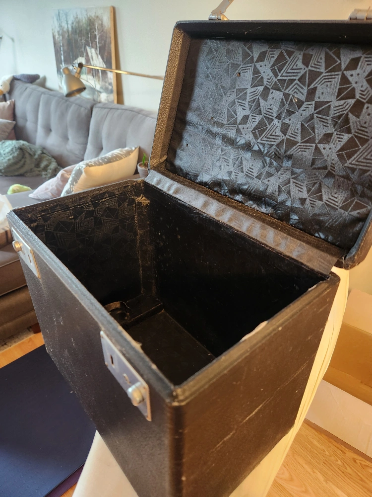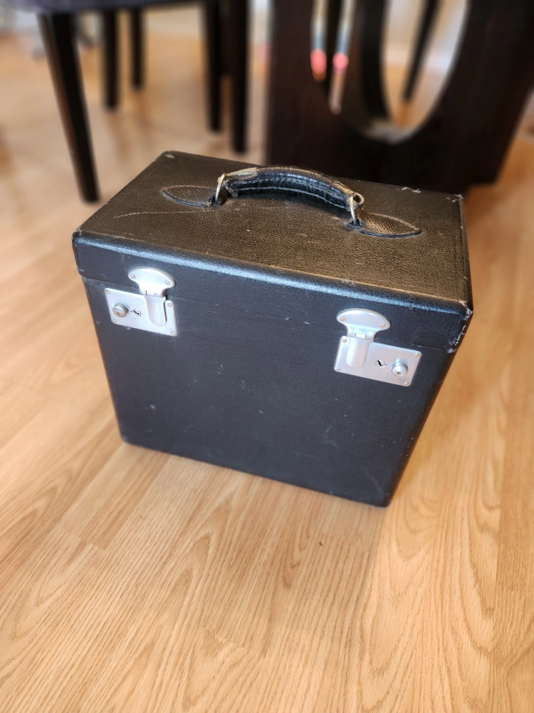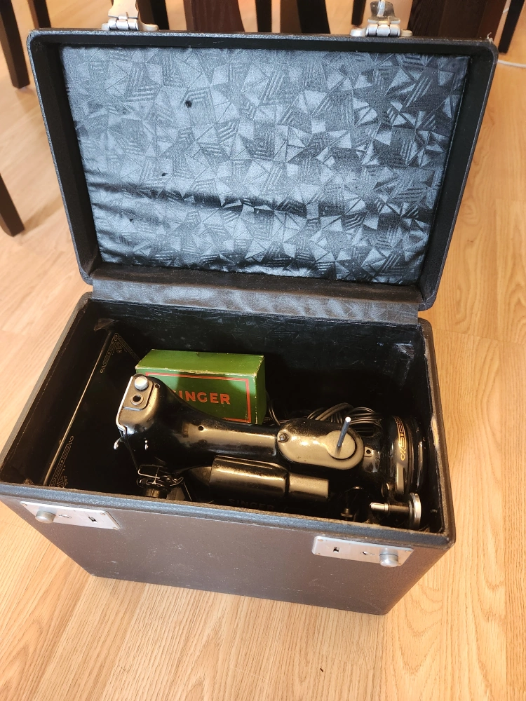 90This vintage Singer sewing machine comes in its original hard-shell case. It includes the foot pedal and power cord. The machine itself is black with chrome accents.