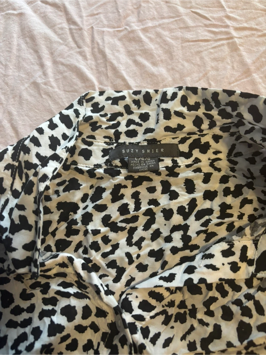 Selling a Suzy Shier shirt in size L. It features a stylish black and white pattern. This shirt is in great condition and ready for a new wardrobe!