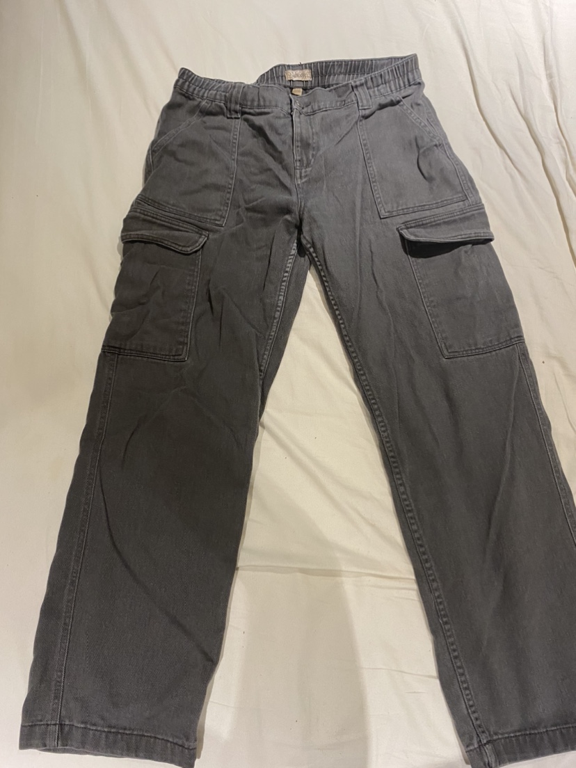 Grey cargo pants with multiple pockets. Good quality and have only been worn a couple times, like new. Machine washable. They are from blue boat