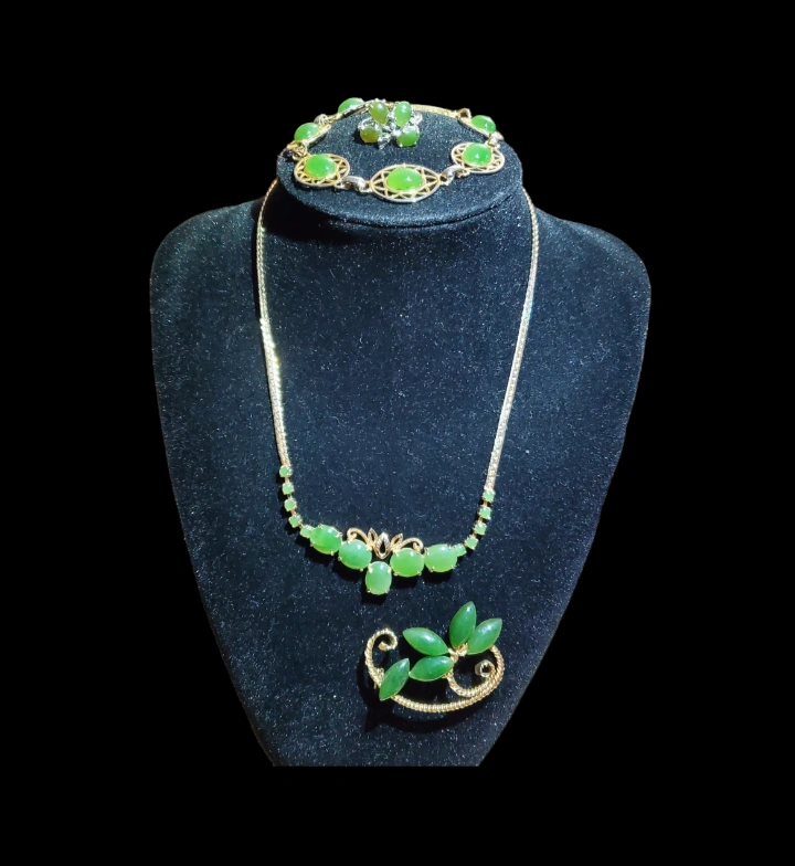 This set includes a necklace, bracelet, brooch, and ring. All pieces features from real BC jades gems and gold-toned metal. Necklace still in excelent condition like new and tarnish free metal. Non magnetic. Gold plated brooch is from my vintage collection . Silver toned ring size 6. Gold and silver toned bracelet size 7".