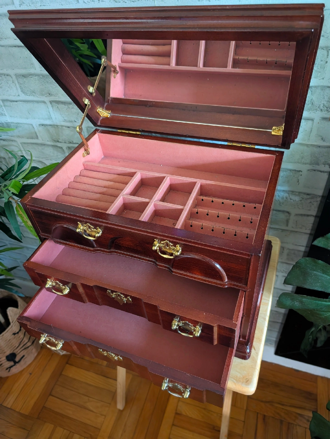 238This is a lovely jewelry box by Gunther Mele. It's styled by Appeler Par and features a rich, SOLID wood finish with gold-tone hardware. The interior is lined with a soft, pink fabric, perfect for keeping your treasures safe and organized! It has a top compartment with a mirror and several drawers for ample storage Measurements: 12H x 10.4D x 17W This particular style is highly sought after.