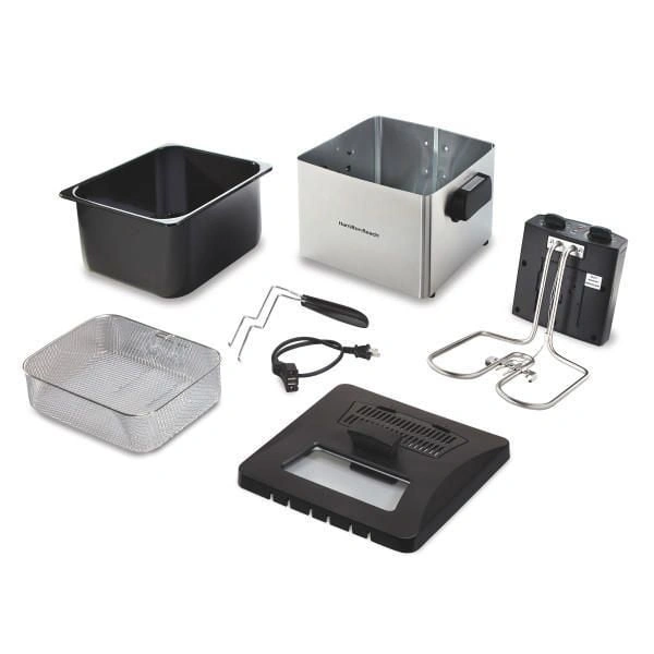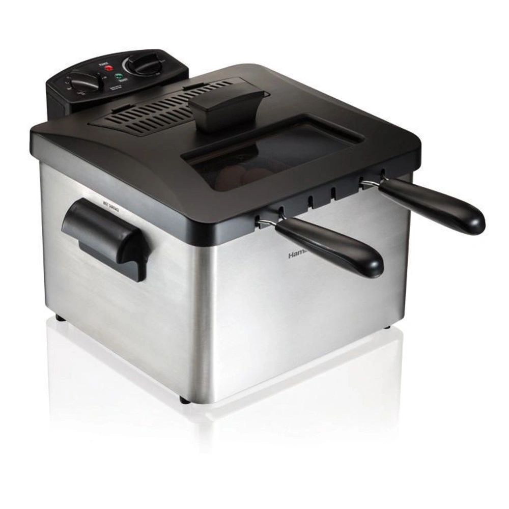 The Stainless Steel Hamilton Beach 4.5-Litre Deep Fryer is a deep fryer that helps you heat and cook a variety of food all at once. With three baskets you can cook a large batch or two foods at once. It also comes with an adjustable timer with audible tone, and is easy to use and clean. In addition, the power and ready light lets you know when the temperature is just right. You can prepare meals quick because this product uses an immersed heating element, which fries food fast. The Hamilton Beach Deep Fryer has a breakaway cord, a window on the lid and a basket hook for easy draining. You'll love using this stainless steel Hamilton Beach 4.5-Litre Deep Fryer. Get started now cooking great-tasting meals for your entire family.