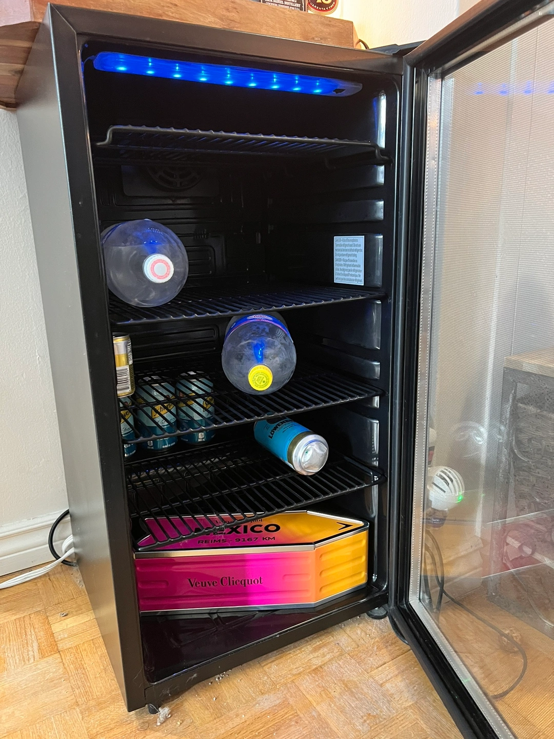 Small beverage cooler with glass door and blue LED lights. Features adjustable shelving. Perfect Conditions, in excellent working order.