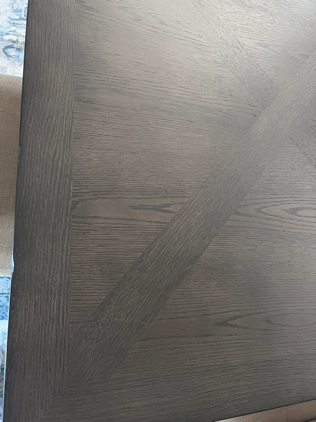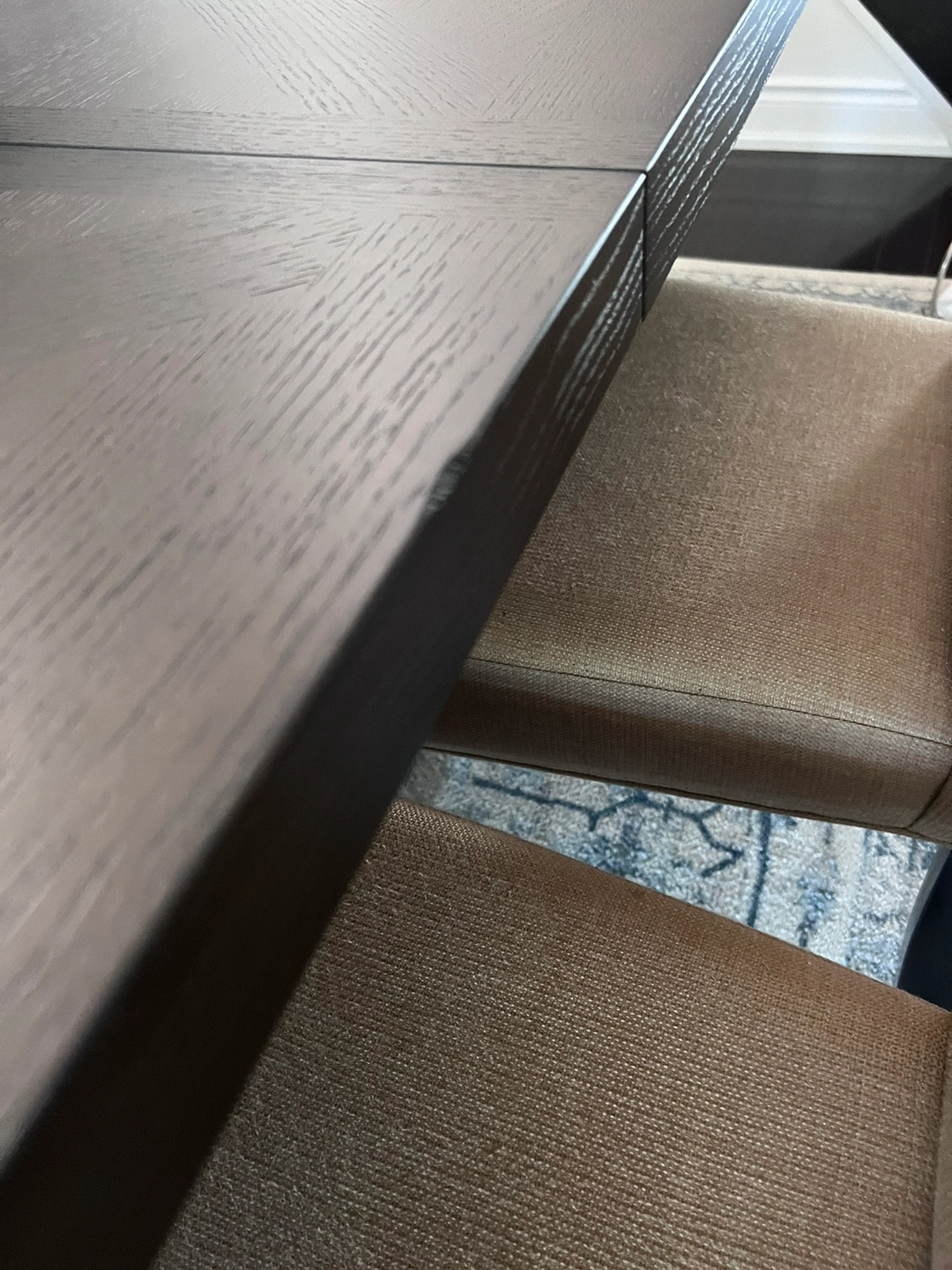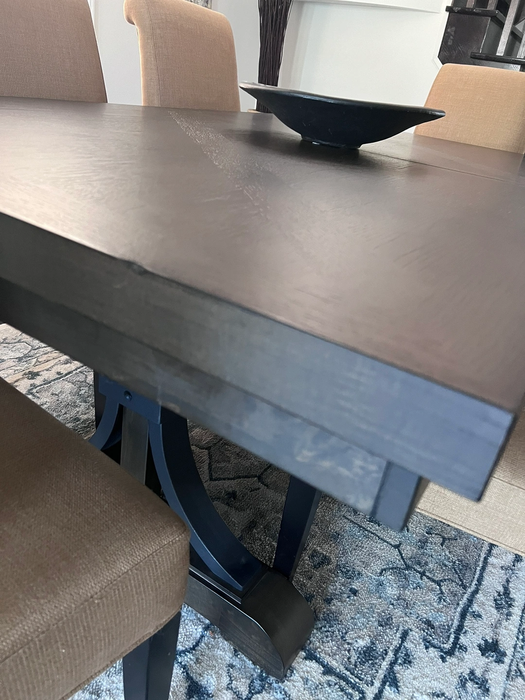 This is a beautiful dark brown partial wood table with leaf. It has a pattern on the surface and some tiny “rustic” edge features as shown. It was purchased and manufactured Oct ‘23 but we’ve only had it a few months. It has barely been used and has NEVER been used without a heat resistant pad and tablecloth. There are no marks at all- it is in BRAND NEW condition. It comes with 1 leaf (24”) and table without it measures 76” x 42” wide. (With leaf 100” x 42”). Has high quality mechanism for installing the leaf, and beautiful iron and wood detail on the base. (Chairs are not new and NOT included in this ad but for $1100 you can have the table plus all 6 of them).