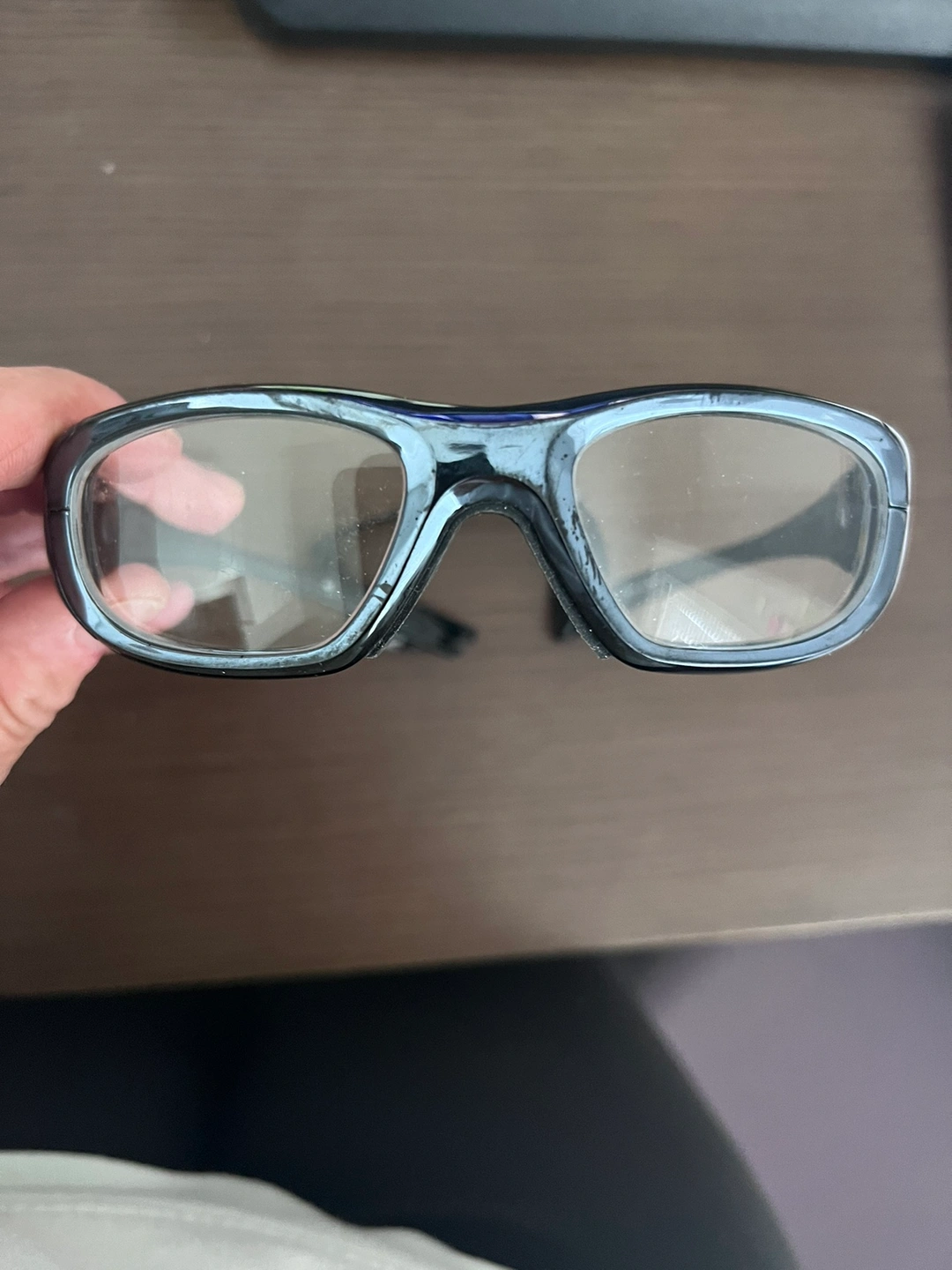 248High quality, flexible and specially fitted frames for kids in sports. These have lenses in my son’s prescription but you can pop them out and have lenses made for your child. They have a back strap that is adjustable. Rubber cushioned nose piece adds to the comfort and stability while playing sports. There’s are scratches on the surface of the frames which I’ve tried to show in pics. The pull for the zipper on the case broke off but it can still be slid open and closed.
