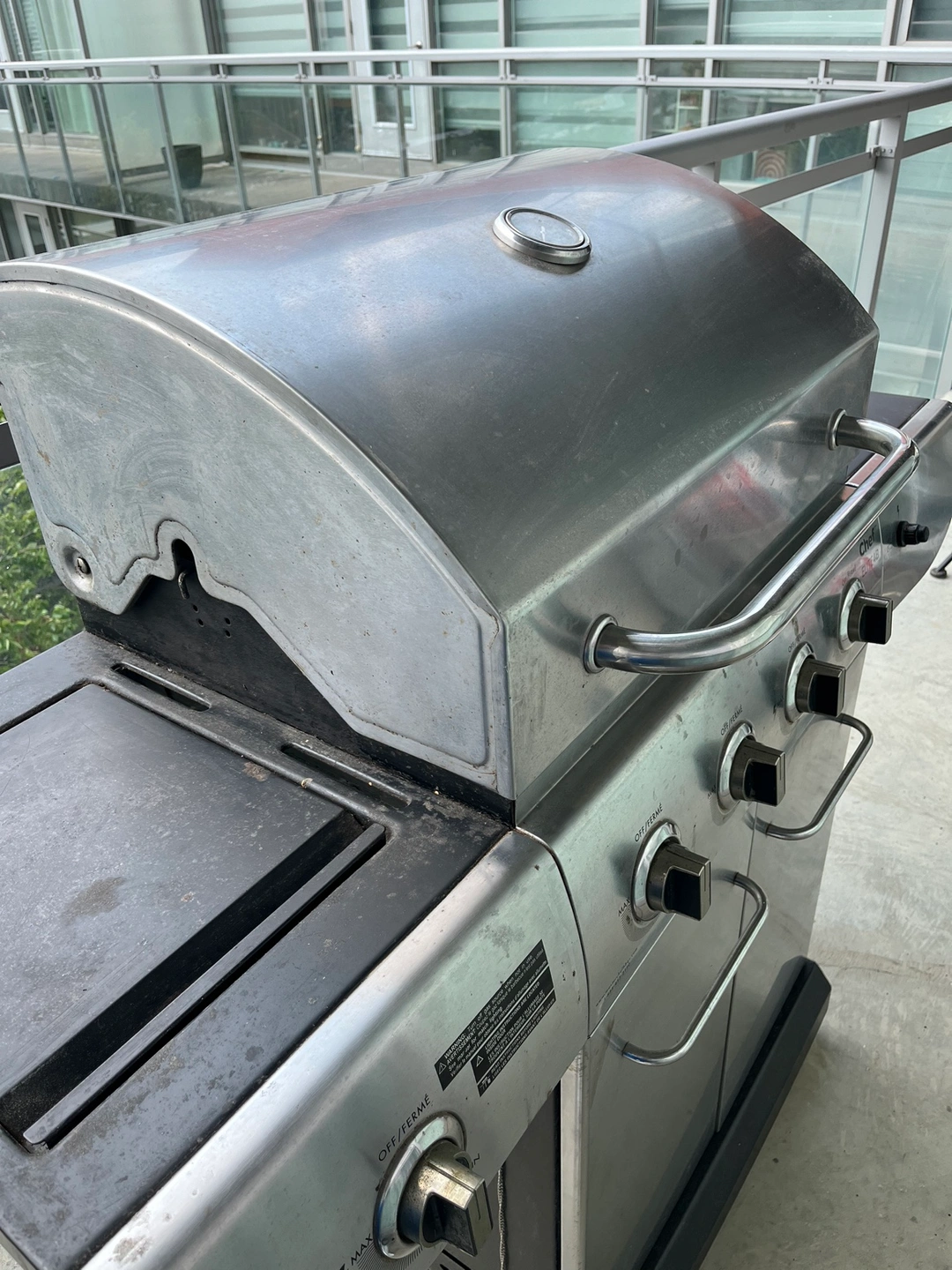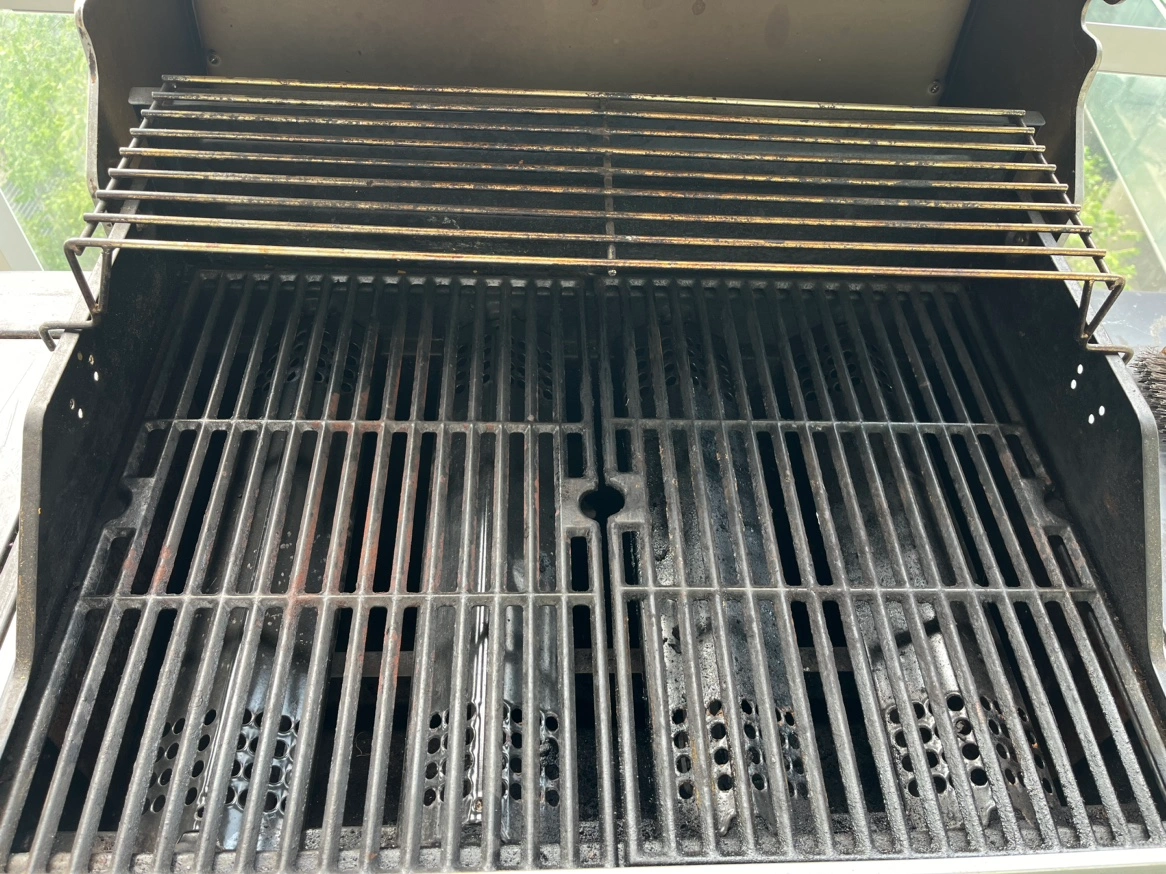 Sturdy BBQ with built in igniter, side burner, Rotisserie, porcelain cast iron cooking grates with large surface area (650 square inches). Cast iron griddle can be used to make breakfast/pancakes. Ideal for hosting large family get togethers.