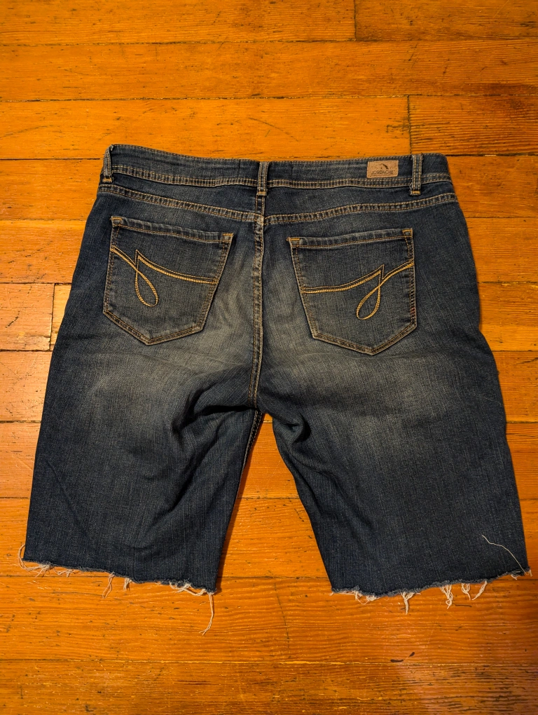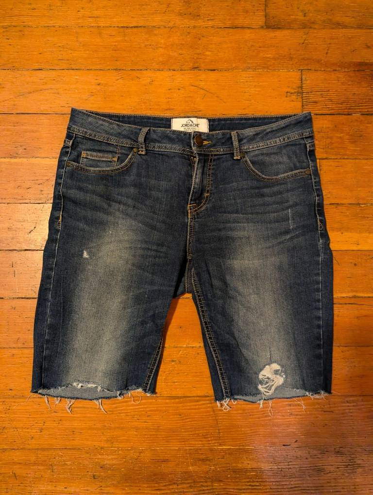 Ladies navy blue mid rise skinny jean shorts ( Jorts ) from early 2000's by Jordache. Size 8. Fit above the knee.