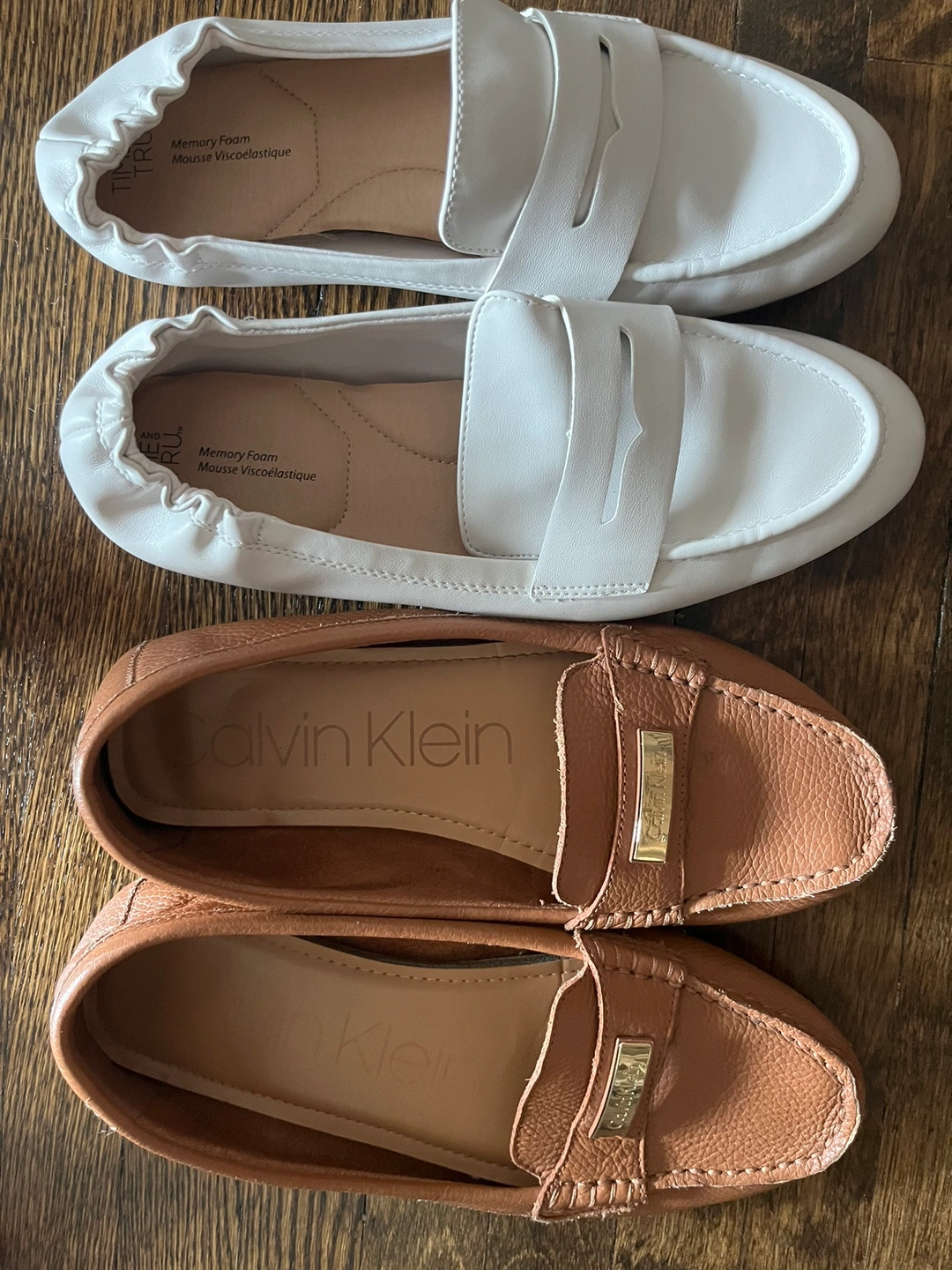 Two pairs of shoes. One greyish pair and one tan pair. Tan are leather loafers, grey are not leather