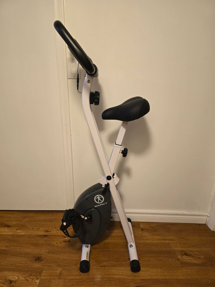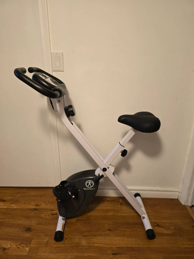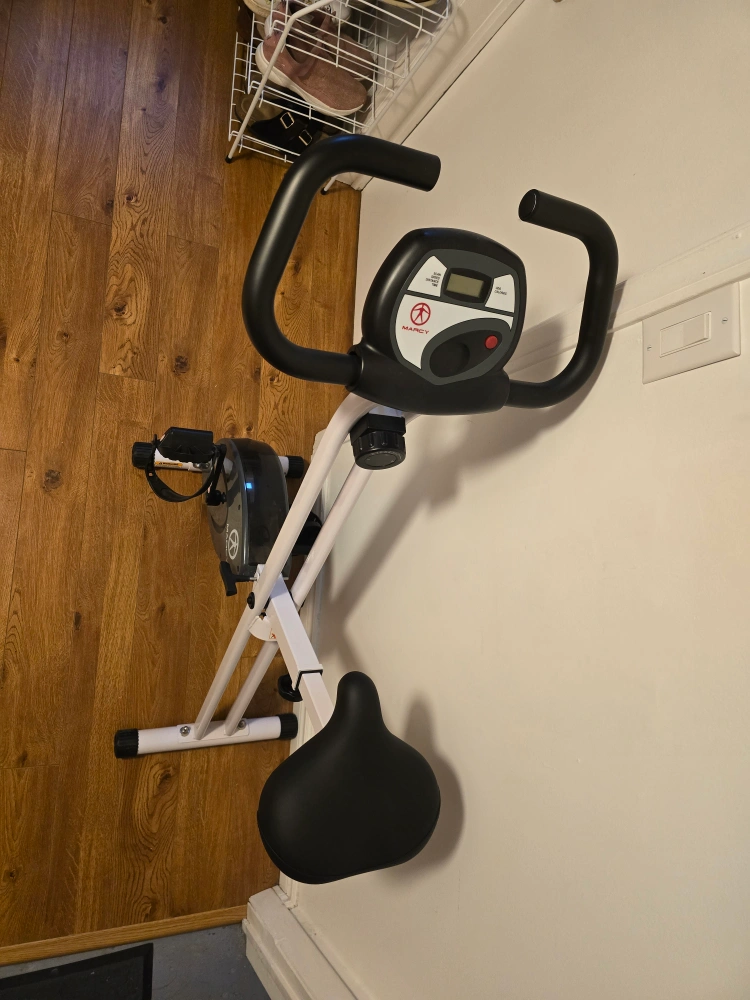 This Marcy folding exercise bike is in excellent condition. It has been used very little and comes with a digital display that shows time, speed, distance and calories. It is easy to fold and store. It is a great way to get a cardio workout at home.