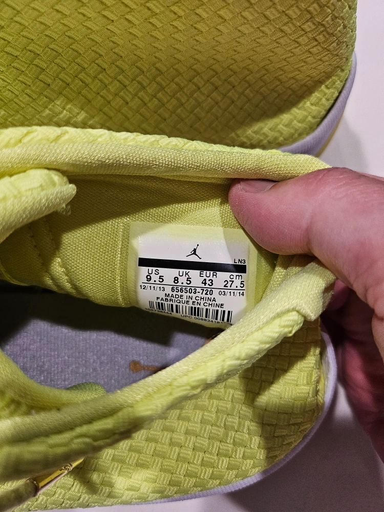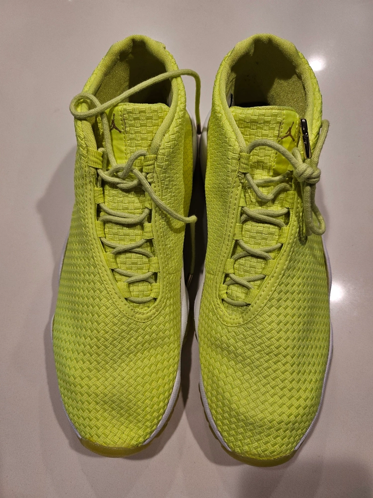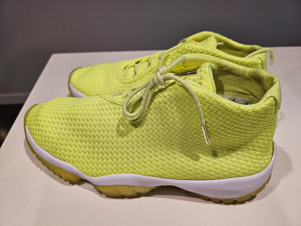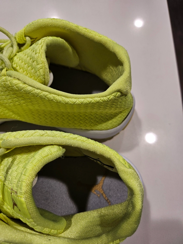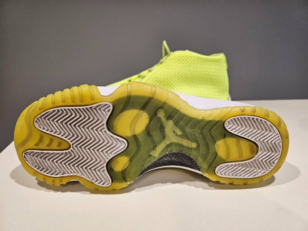 These are a classic pair of Air Jordan 11s. The shoes are a bright yellow and have a white sole. They feature a woven upper and a high top design.