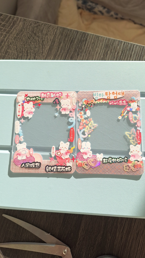 These are two clear photocards with decorative borders and stickers. They are blank inside, perfect for photos and mementos!