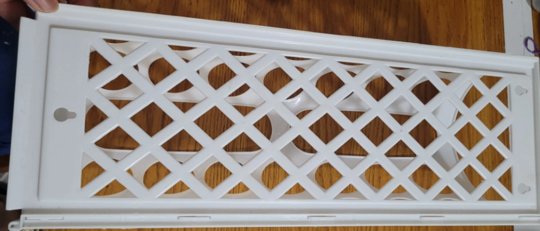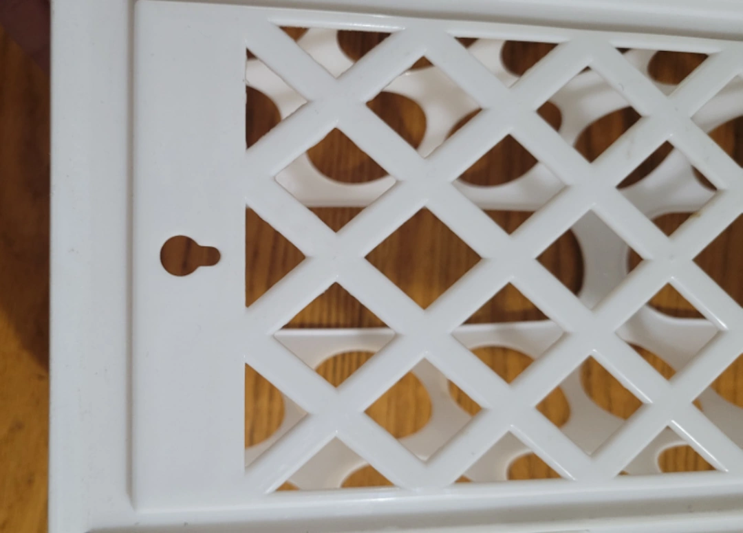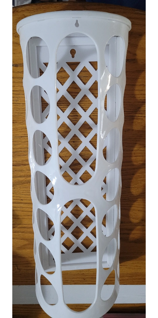 White plastic bag dispenser with a built-in grid to hold the bags in place. It has a hole for hanging and can be easily mounted to any wall.