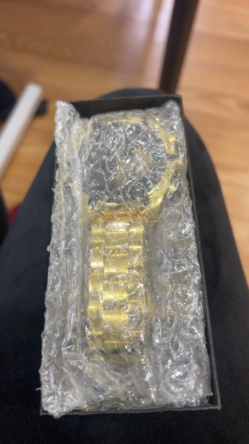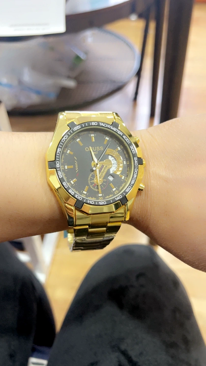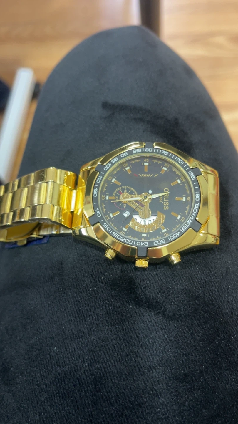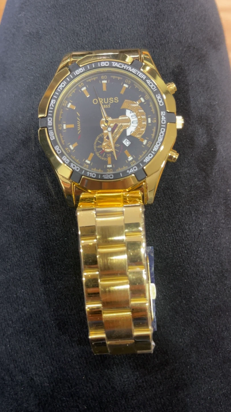 ORUSS gold fashion watch. It features a black dial with gold accents and a stainless steel band. The watch comes in its original box.