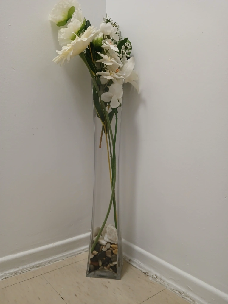 A tall glass vase. It is clear and has a wide mouth and a narrow base. It is filled with small stones at the bottom.