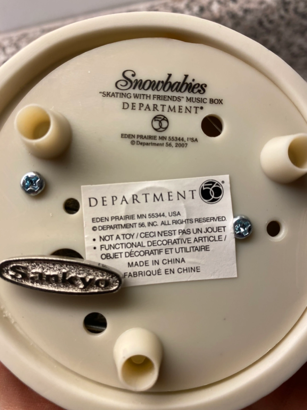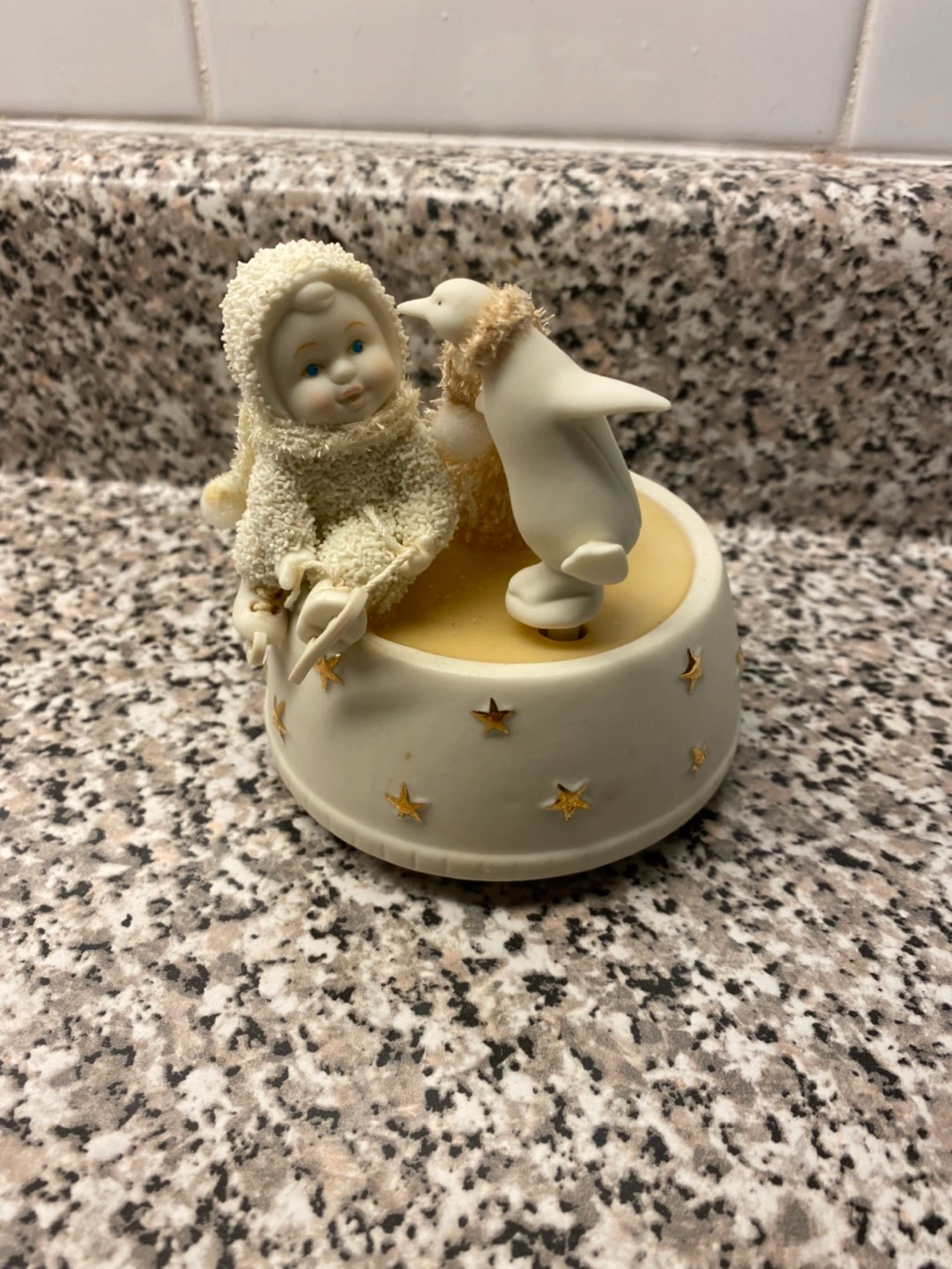 This is made of porcelain or glass, so it’s not suitable for young kids. It plays a Christmas song and the penguin spins.