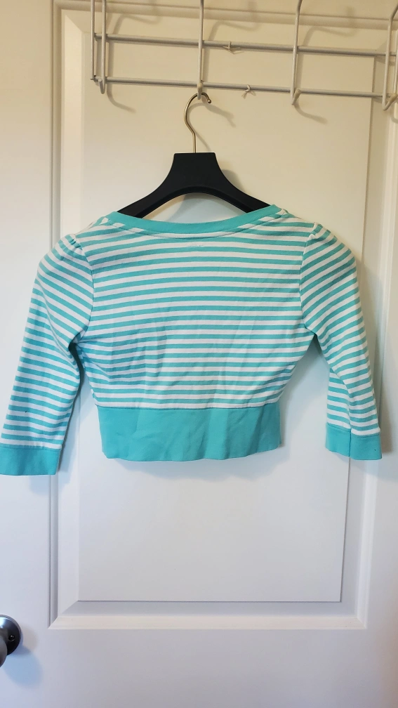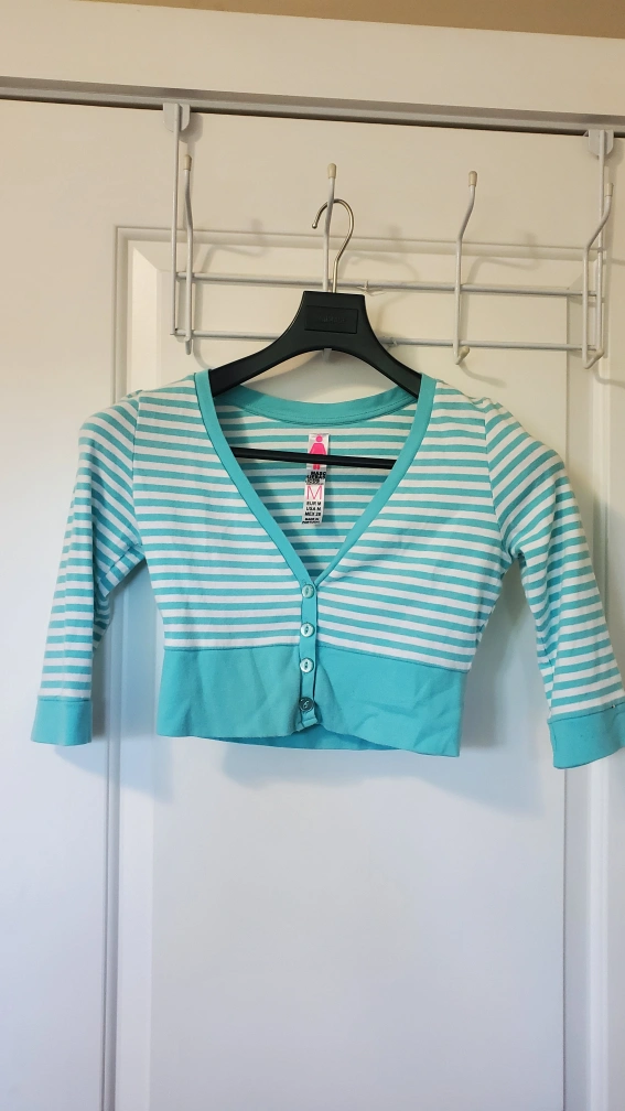 Blue and white striped cropped cardigan with 3/4 sleeves. Features a v-neck and button up front.