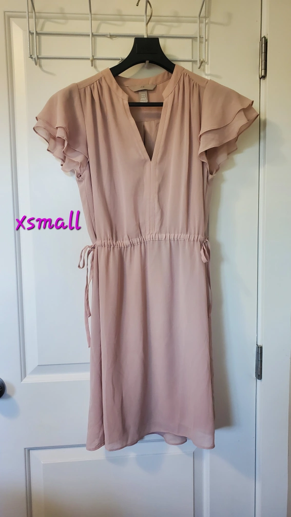 48xsmall - ballerina pink xxsmall - dark teal tie up embellishments on both sides of dress ruffled sleeves knee length v-cut neckline please ask about bundles on multiple items from my page!