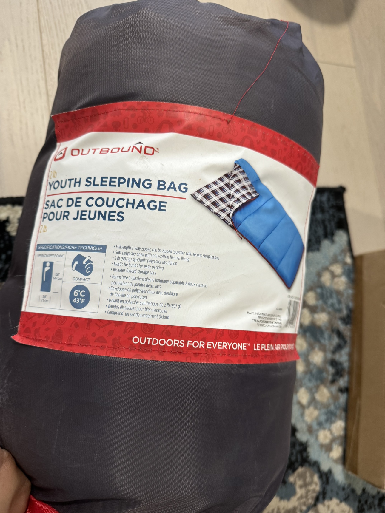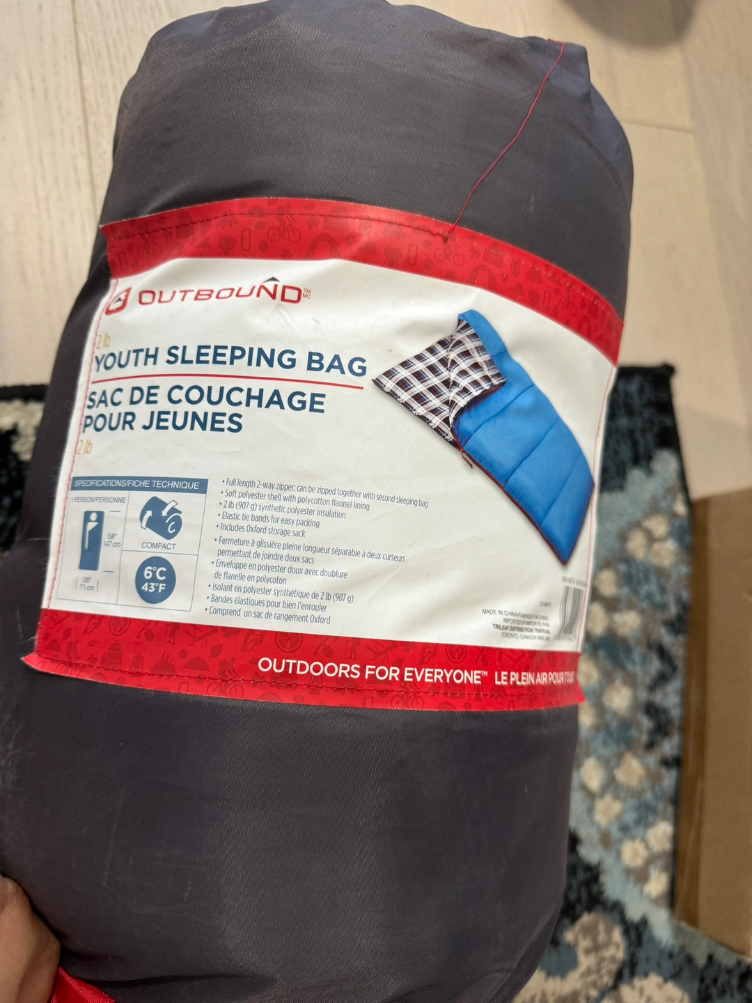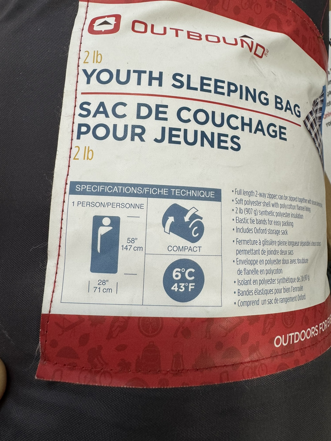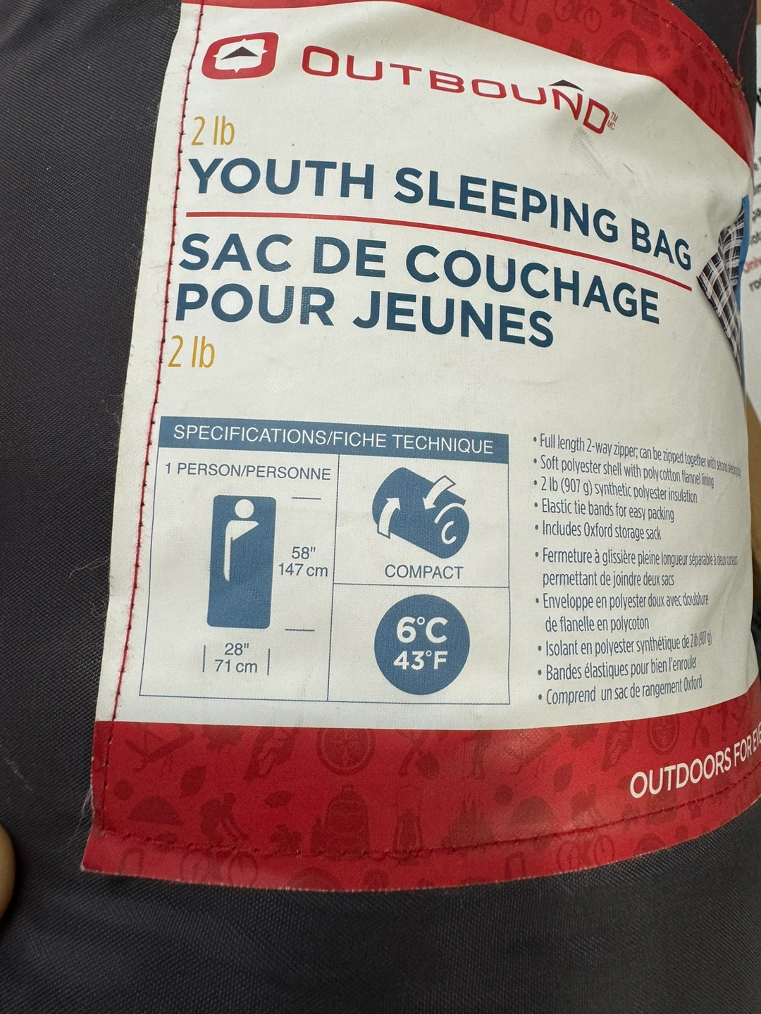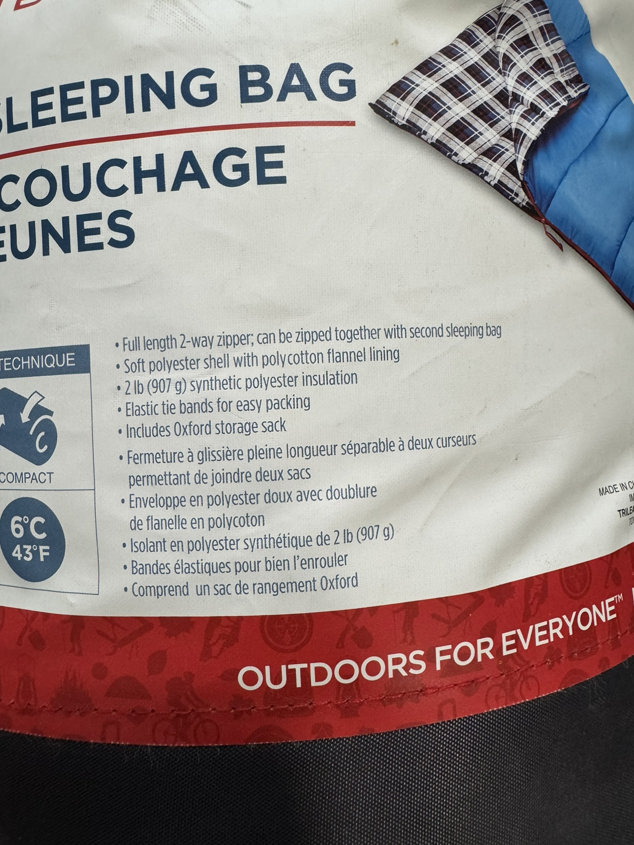 Full length 2-way zipper that can be zipped together with a second sleeping bag. Soft polyester shell with polycotton flannel lining. 2 lb (907 g) synthetic polyester insulation. Includes Oxford storage sack.