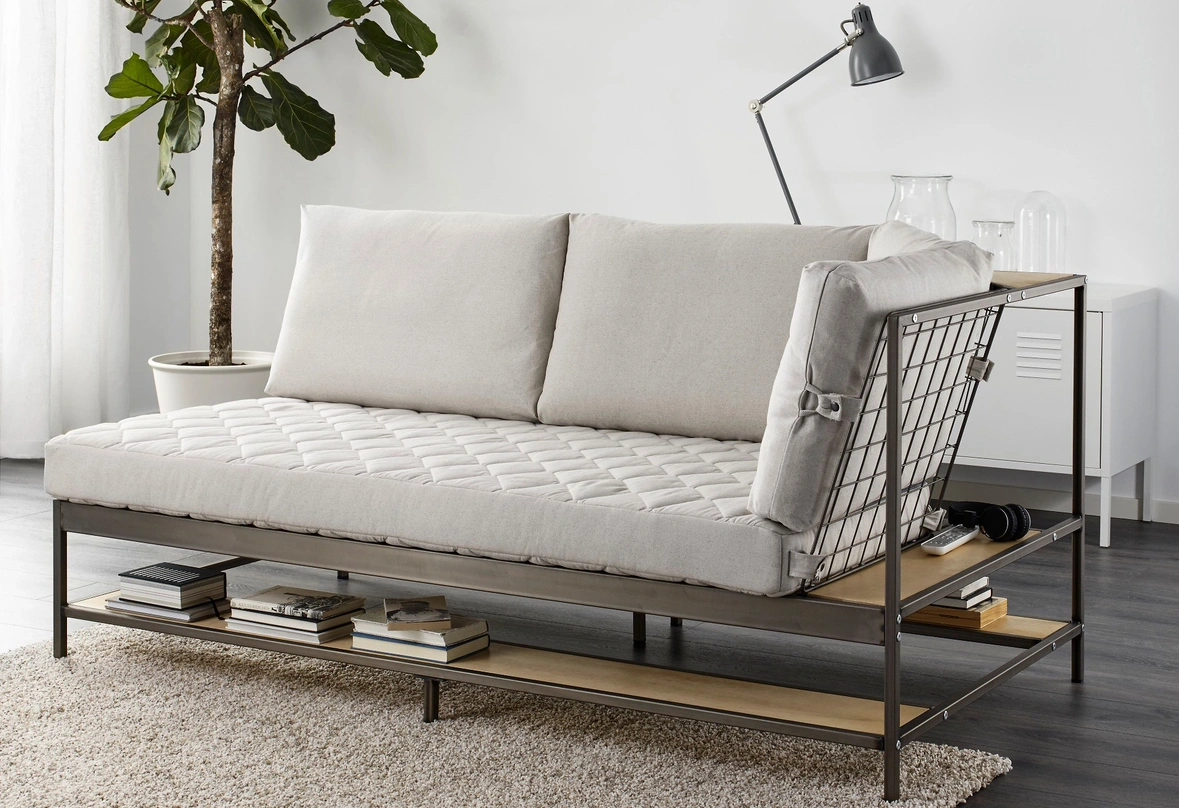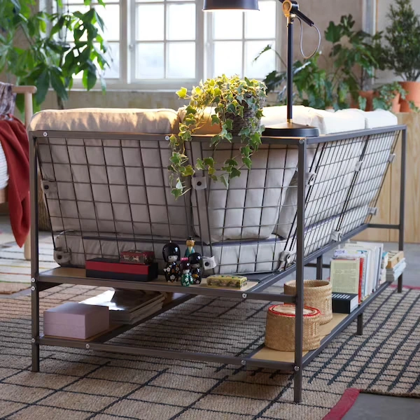 Industrial-style sofa with three seats and lots of storage options. Cushion covers are removable and machine washable. It combines wooden shelves underneath and behind the cushions within a metal frame to add storage to a piece that often doesn’t have any. for book storage, shoe storage, or for a cleaner look, baskets or boxes to corral stuff like cords, remotes, DVDs and video games, or smaller items.