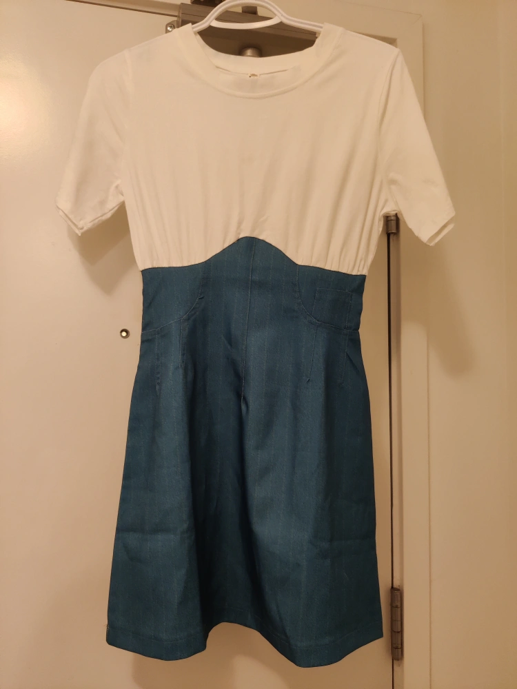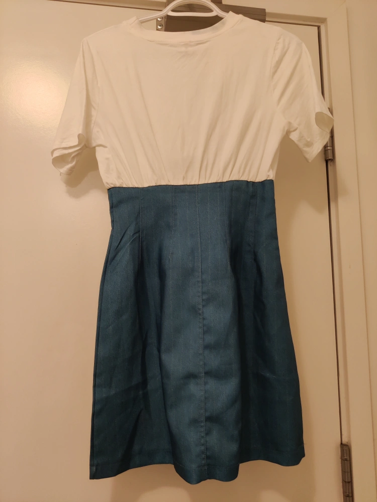 Very cute and special design, top part is cotton shirt, bottom part is silky denim like material. Brand new only washed once. A little color transfer on the back neck part, not very noticeable and also can be seen as a special tie-dye design 😜
