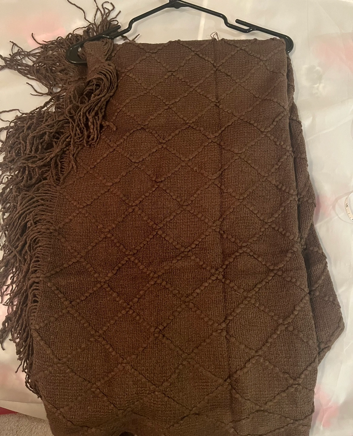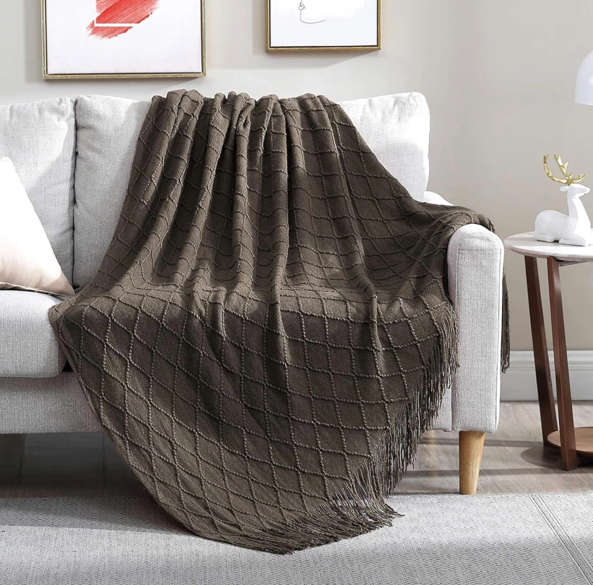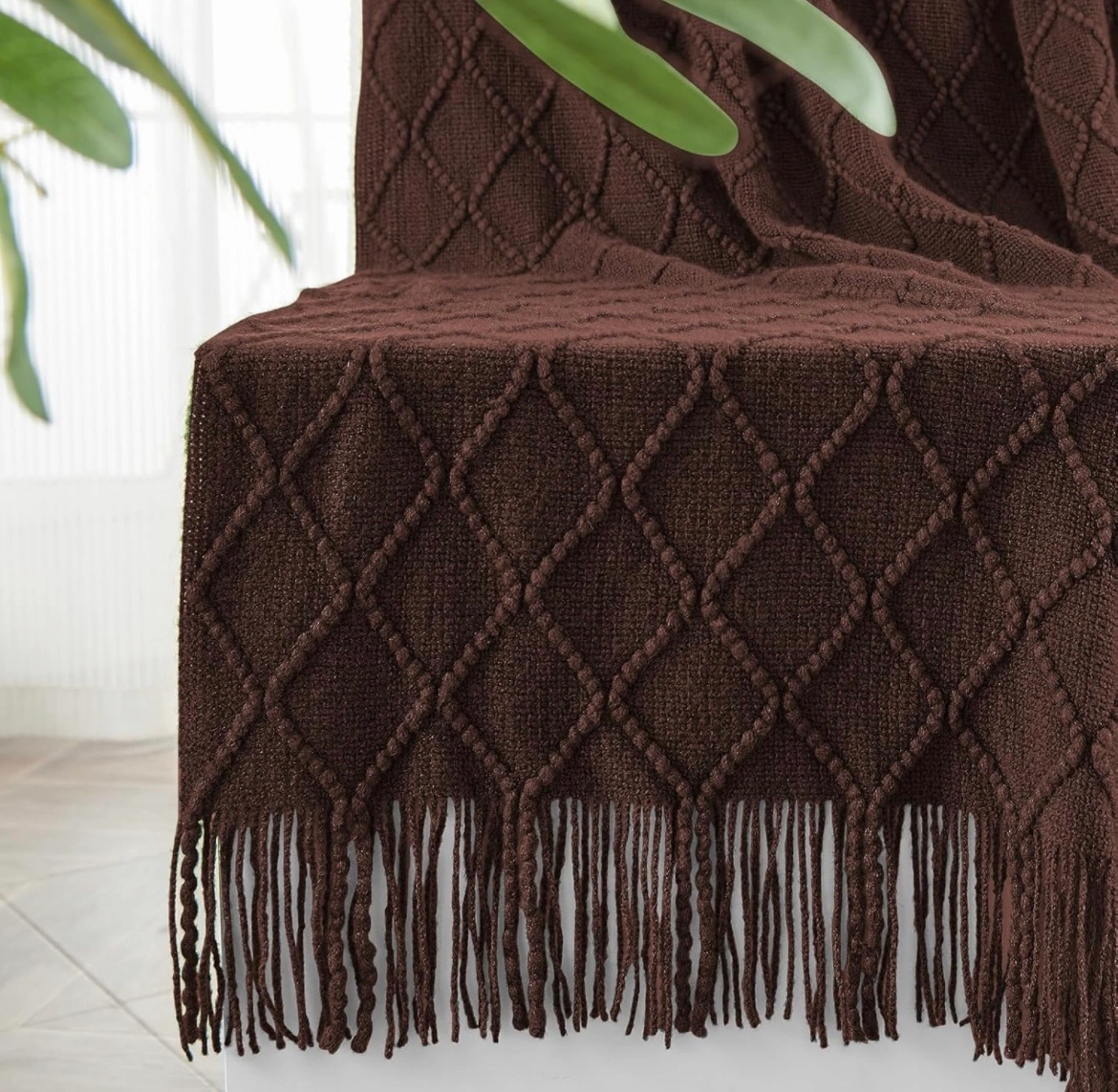 Soft, knitted throw blanket with a diamond pattern and fringe. Perfect for adding a touch of warmth and style to your home. It is a great size for draping over a couch or bed.