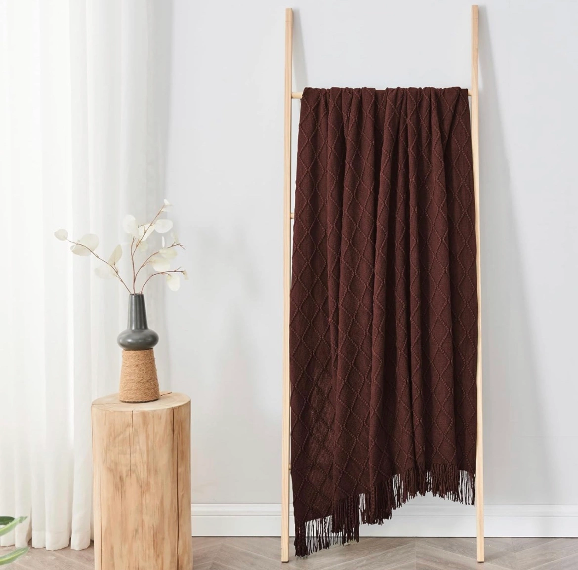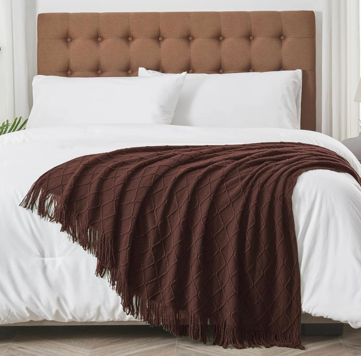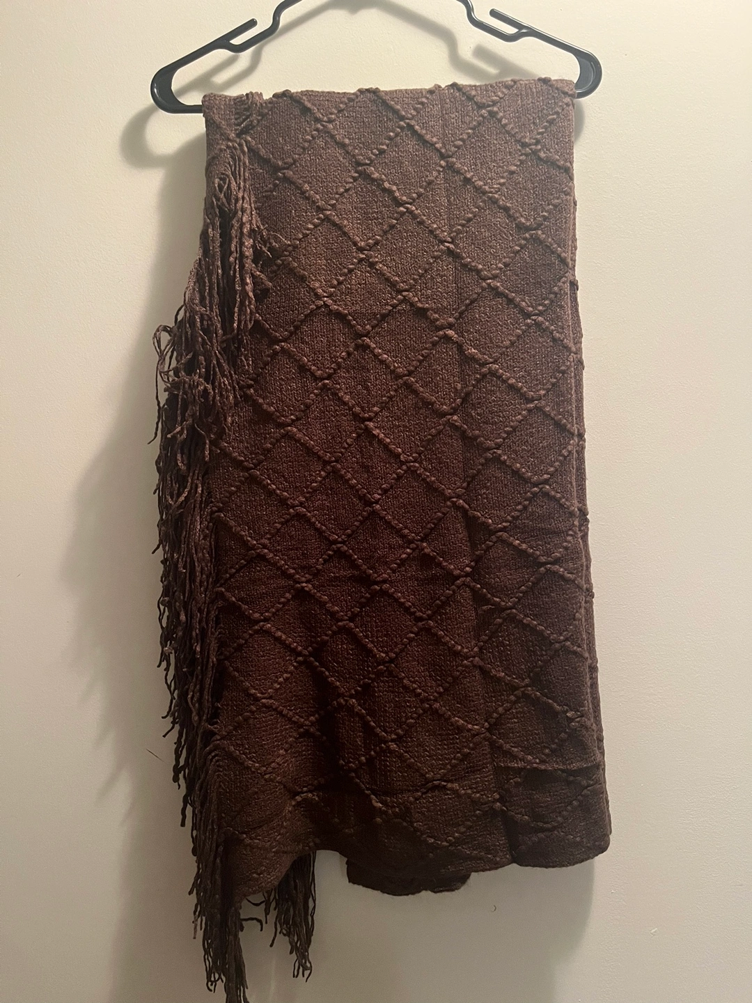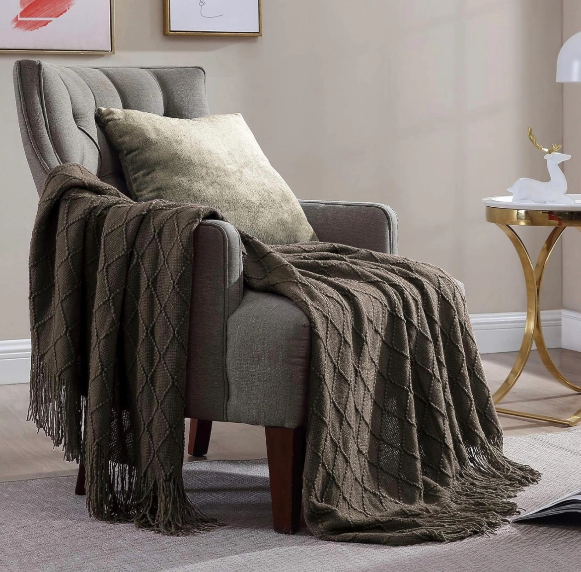 Soft, knitted throw blanket with a diamond pattern and fringe. Perfect for adding a touch of warmth and style to your home. It is a great size for draping over a couch or bed.
