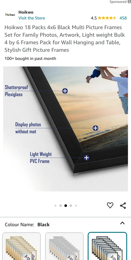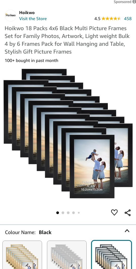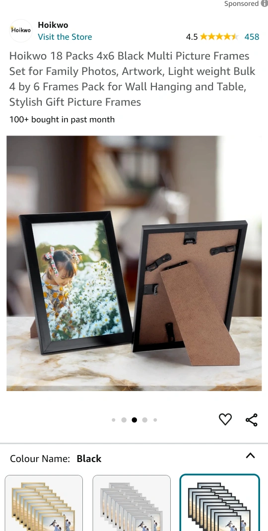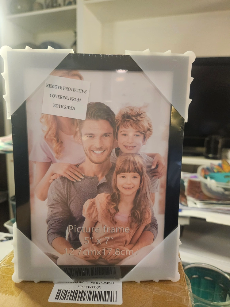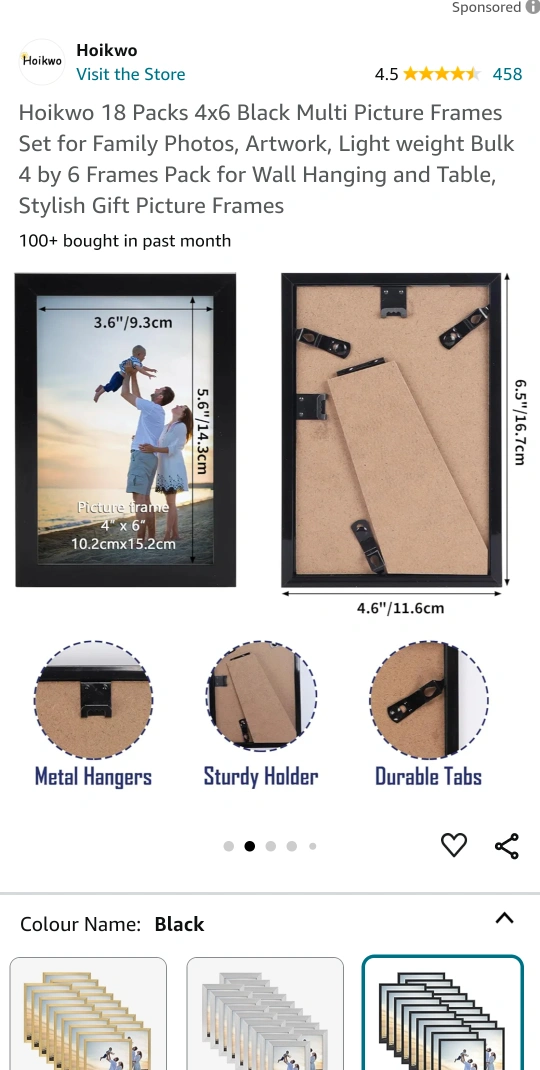 Set of 18 black 5x7 inch picture frames. Perfect for displaying photos or artwork. They come with sturdy metal hangers for easy hanging on walls.