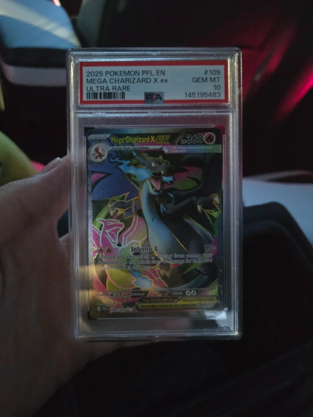 This is a Pokemon TCG Mega Charizard X EX trading card. It's graded GEM MT 10. The card is from the PFL EN set. Authentic real Pokémon