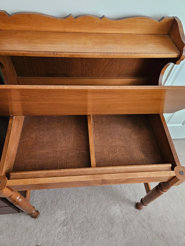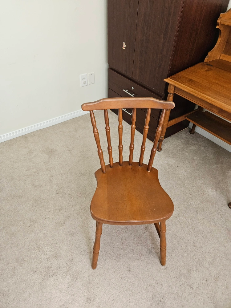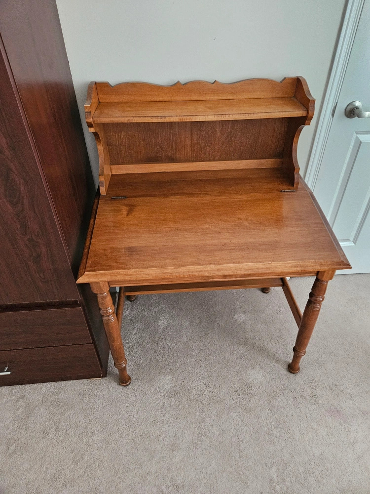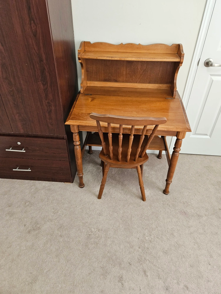 This is a wooden desk with a hutch and a matching chair. It is a great piece for a home office or bedroom. The desk has a drawer and a shelf. The chair is comfortable and sturdy. It is made of real solid wood with natural wood stain on it in perfect condition.Pick up near Ontario Shores Center for Mental Health Sciences, Whitby. I can deliver for nominal delivery charge.