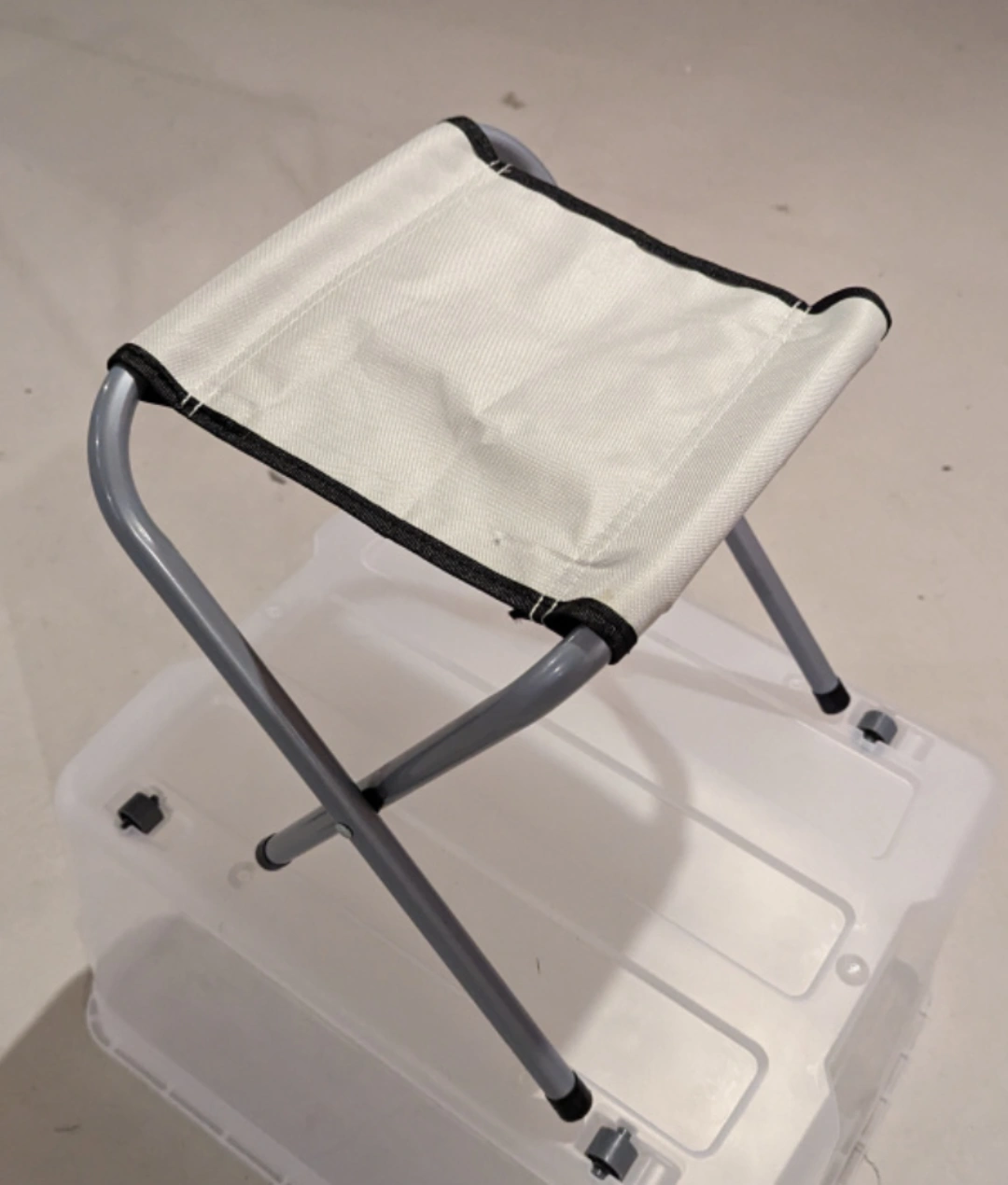 This is a small, folding camping stool. It is made of metal and fabric. It folds up for easy storage and transport. Selling chairs x6