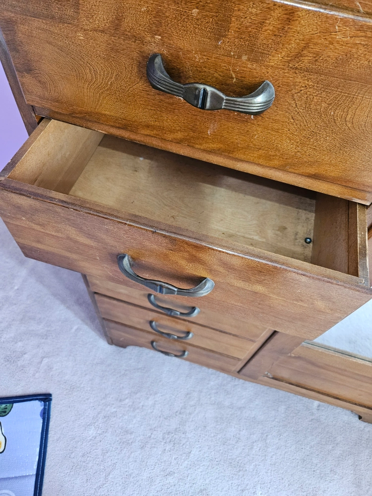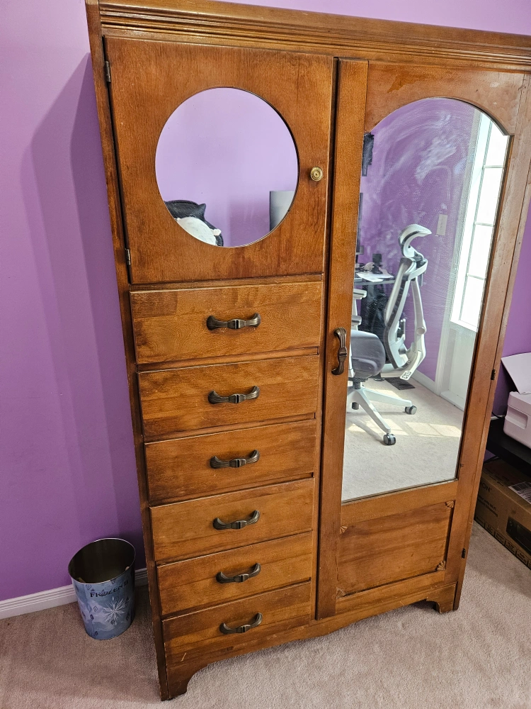 This armoire has 5 drawers and a large mirrored door. There is also a separate door with a circular mirror and a shelf on the inside. It has a vintage feel and would be great for storage or a statement piece in your home. Pick up available near Ontario Shores Center for Mental Health Sciences, Gordon Street, Whitby.