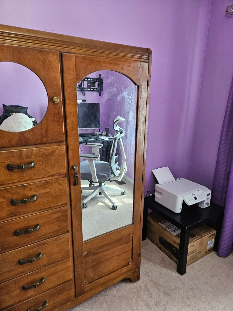 This armoire has 5 drawers and a large mirrored door. There is also a separate door with a circular mirror and a shelf on the inside. It has a vintage feel and would be great for storage or a statement piece in your home. Pick up available near Ontario Shores Center for Mental Health Sciences, Gordon Street, Whitby.