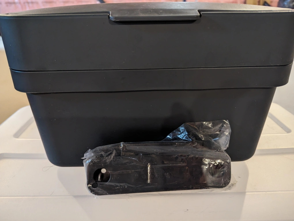 A black under-the-sink wastebasket with a lid. Includes a mounting bracket. Was used but then washed really well. Does not smell and clean. I am: - open to negotiation on the pricing - willing to drop off depending on the area