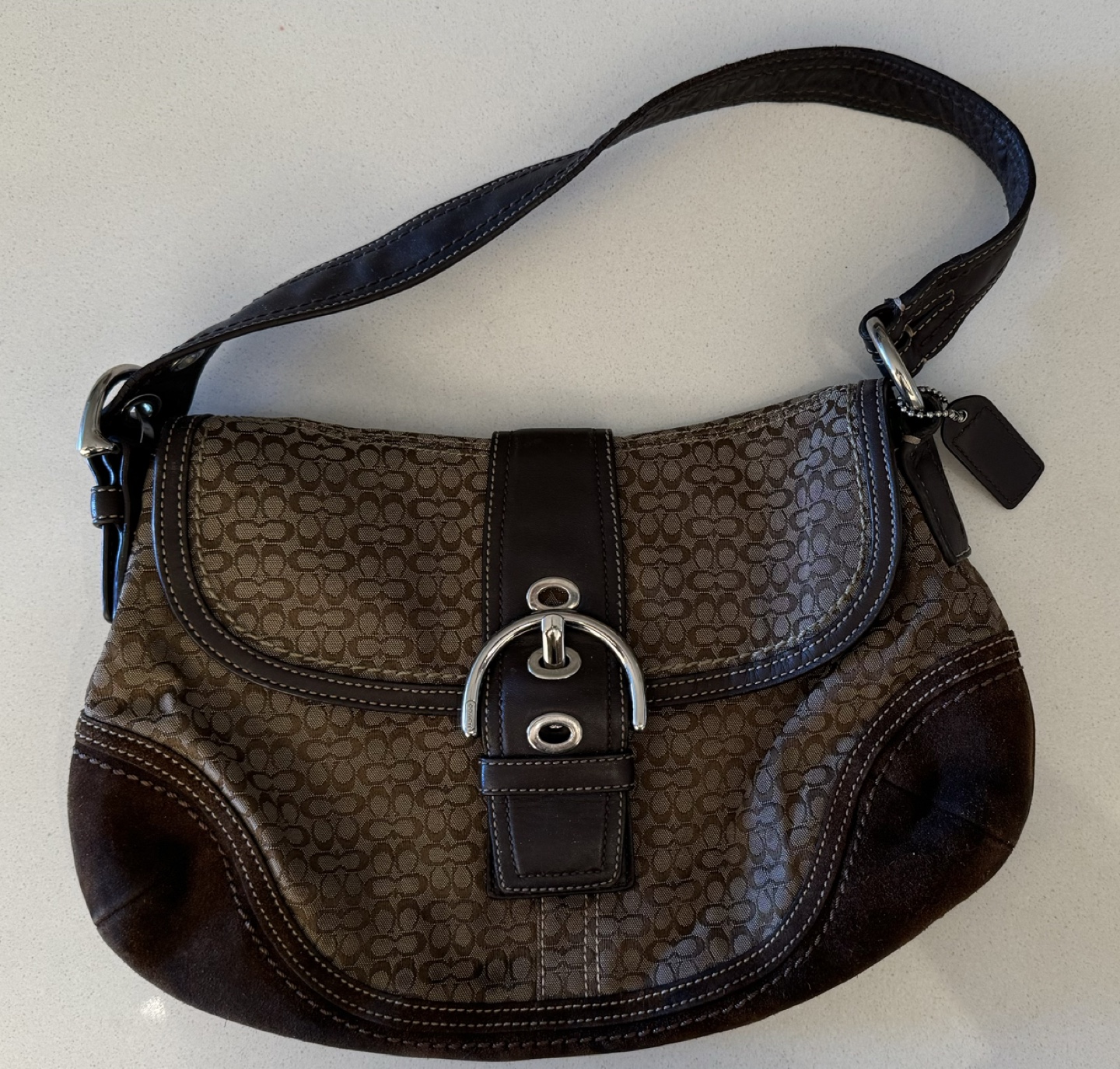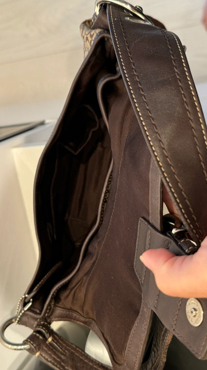 This is a brown Coach handbag with a signature C pattern and a brown leather buckle. The handbag has a brown suede bottom and a brown leather strap.