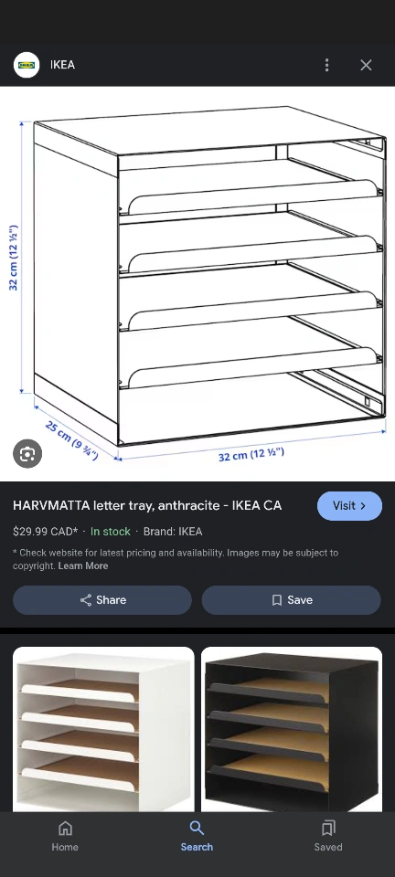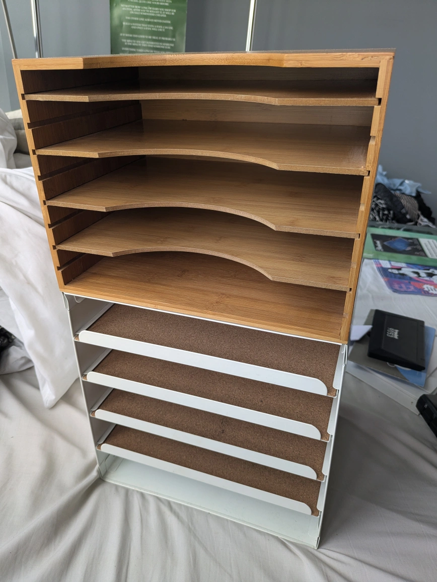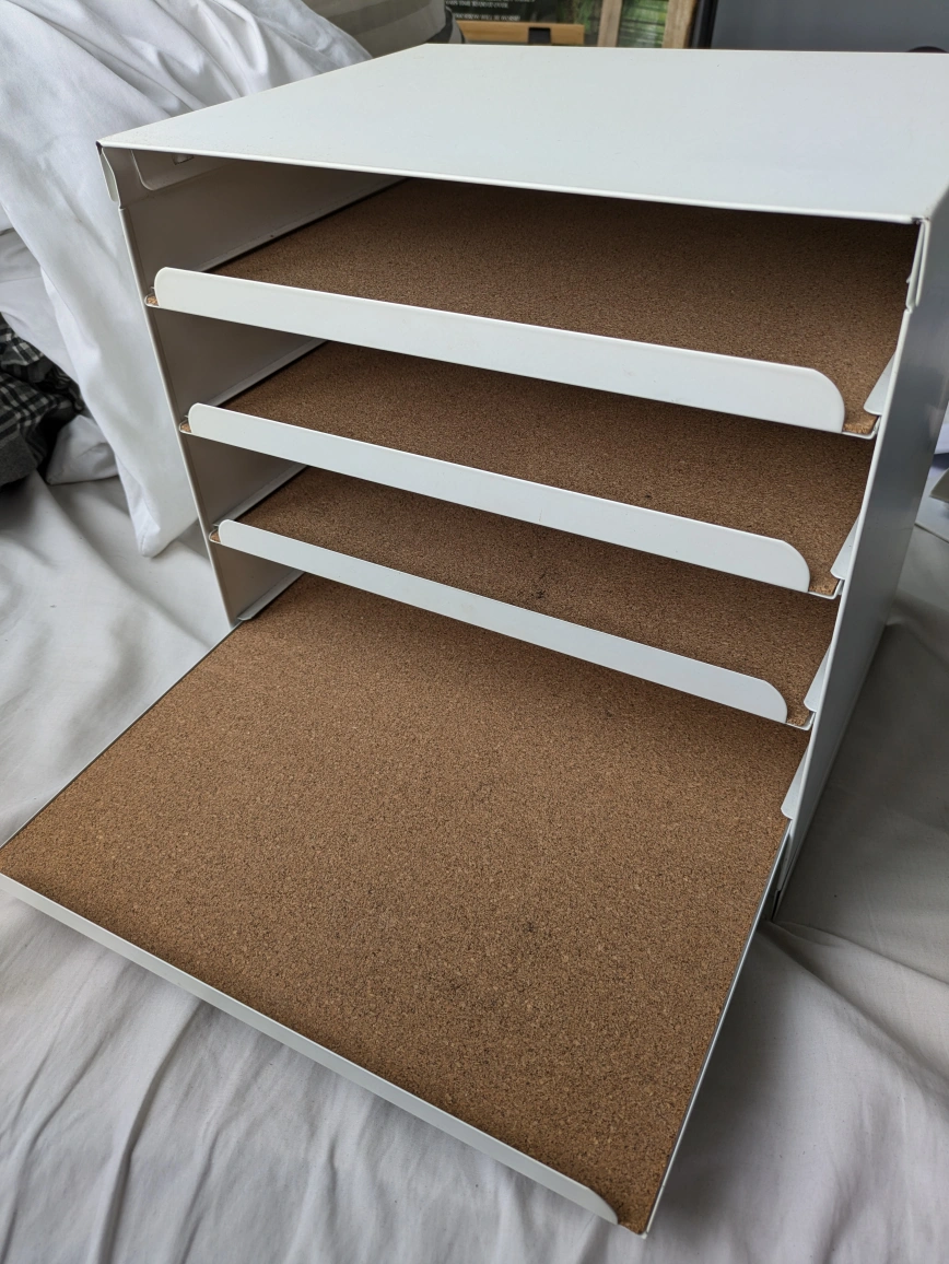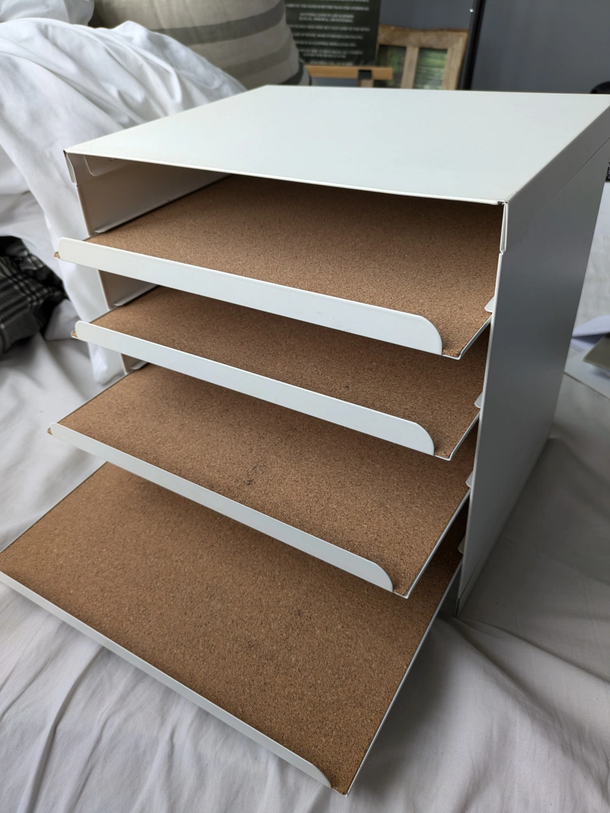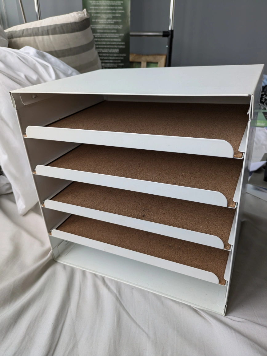 White metal desk organizer with pull-out shelves. It has a cork backing on the shelves to keep things in place. I used it for makeup but Ikea sells it for desk/file organization.