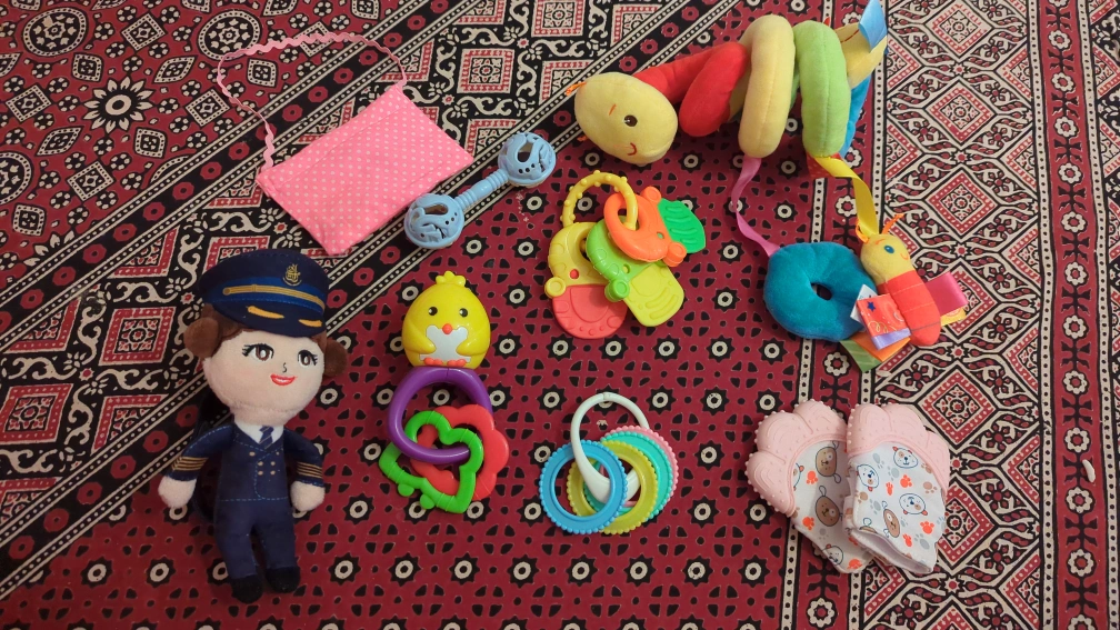 A bundle of baby toys including a plush airplane pilot, a rattle, a teether, a crinkle toy, a soft toy, and a pair of teether gloves.
