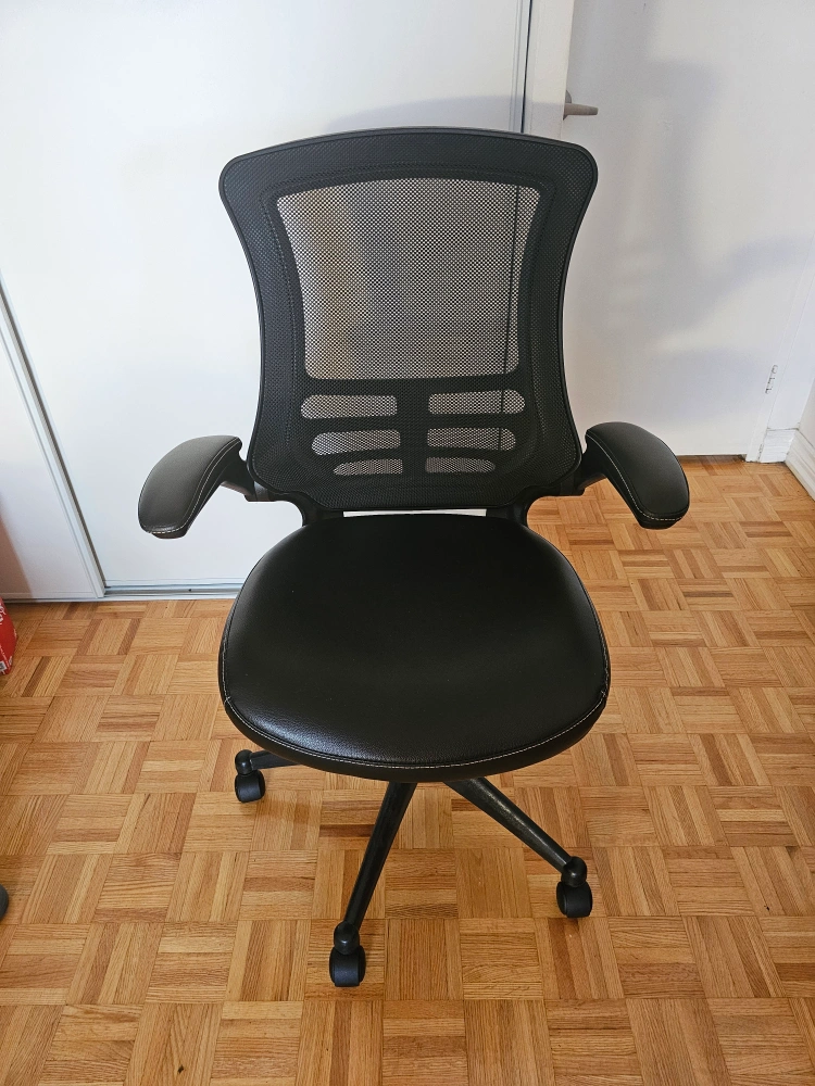 Office chair with black mesh back and black leather seat, includes adjustable armrests and height adjustment. *Very lightly used and in perfect condition!*