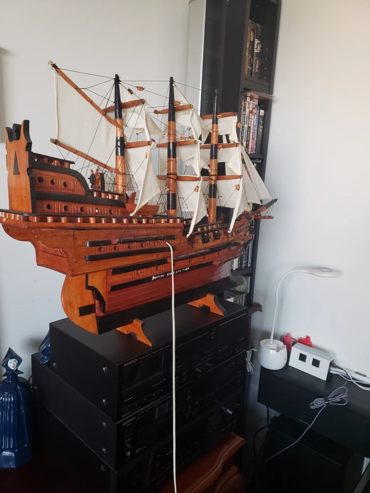 A large wooden model ship. It is on a stand with an inscription on the bottom, it lights up making an excellent light ambiance. it measures 32" long by 24" high by 7" wide