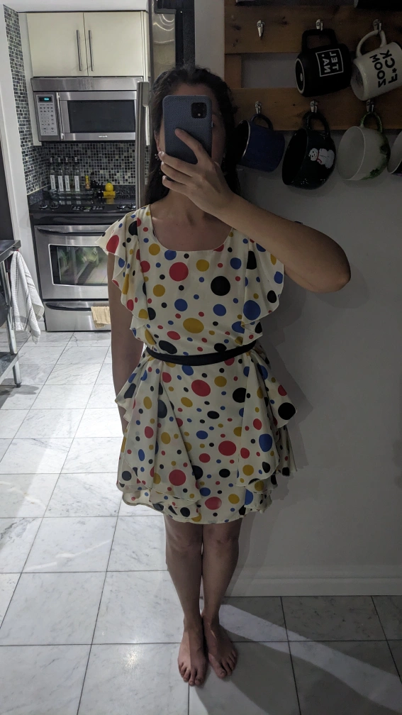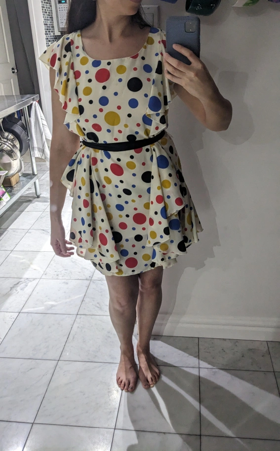 Polka dot size small dress. Length goes to approx. mid-thigh. Zipper on the side (as shown in picture). Worn once for a party. Excellent condition, dry cleaned after worn.