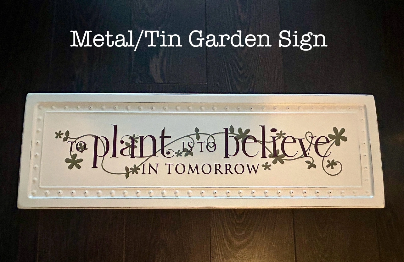 Metal Garden Sign w/t Quote in vinyl lettering.