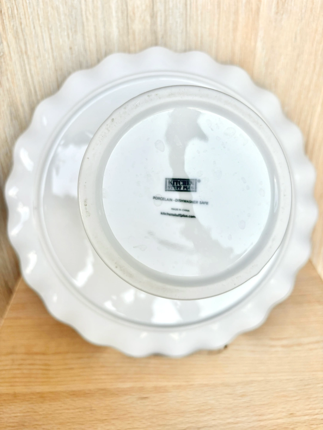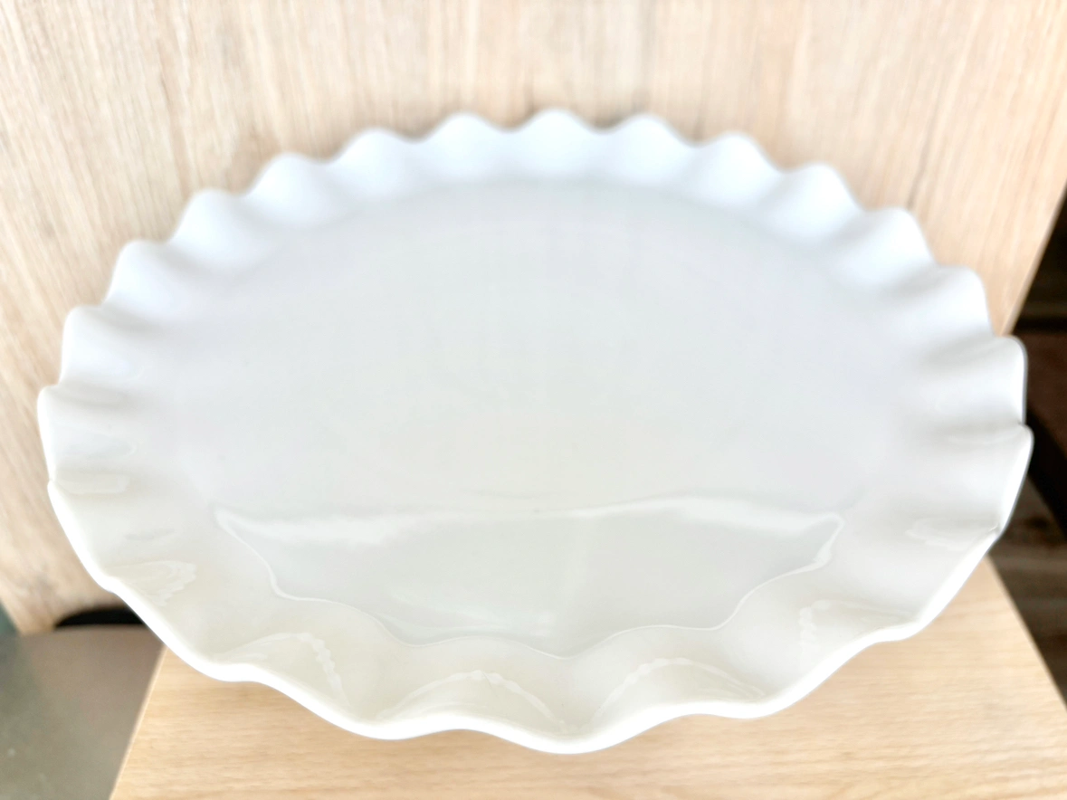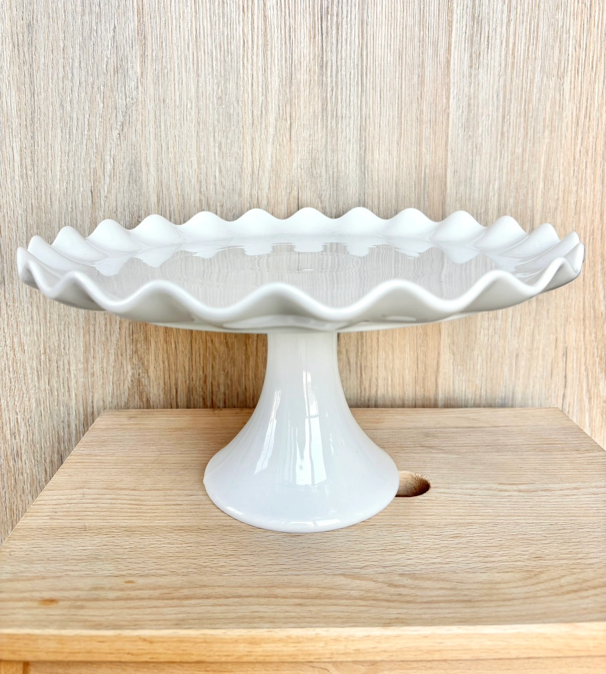 687Pick up at Dundas and River Beautiful white porcelain cake stand with fluted edges. Dishwasher safe. Retails for $34.99 plus tax.