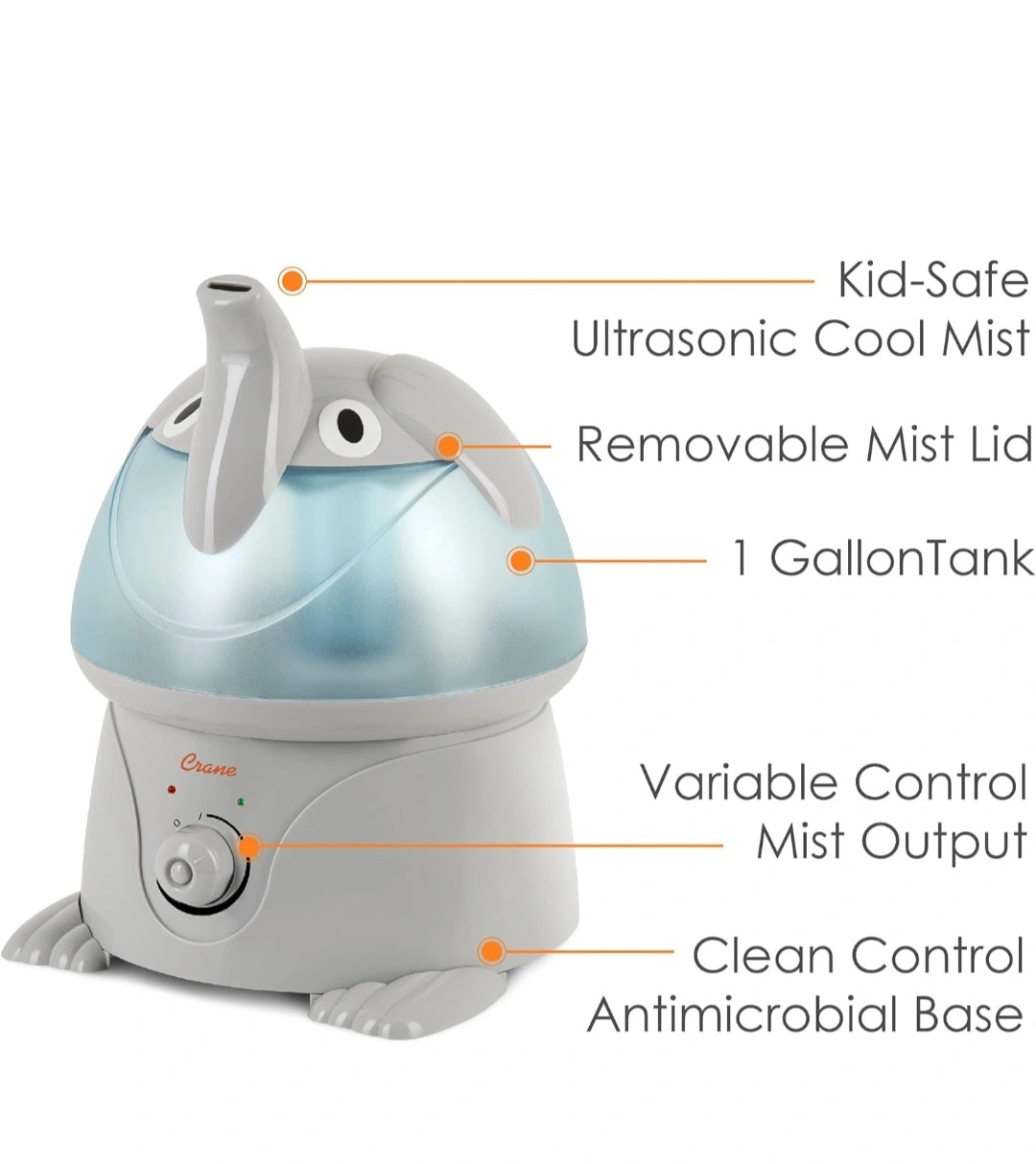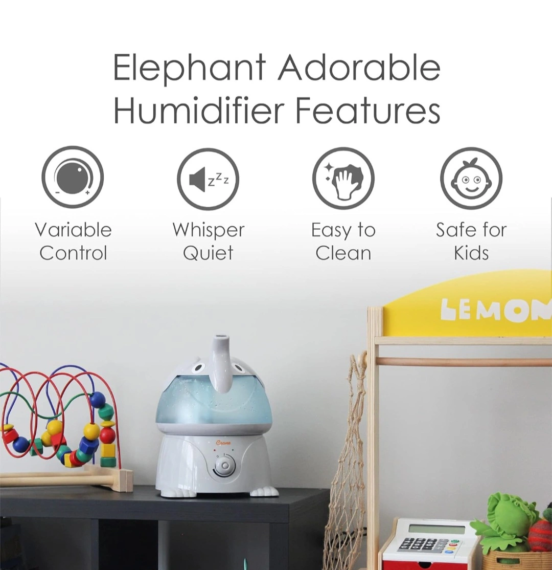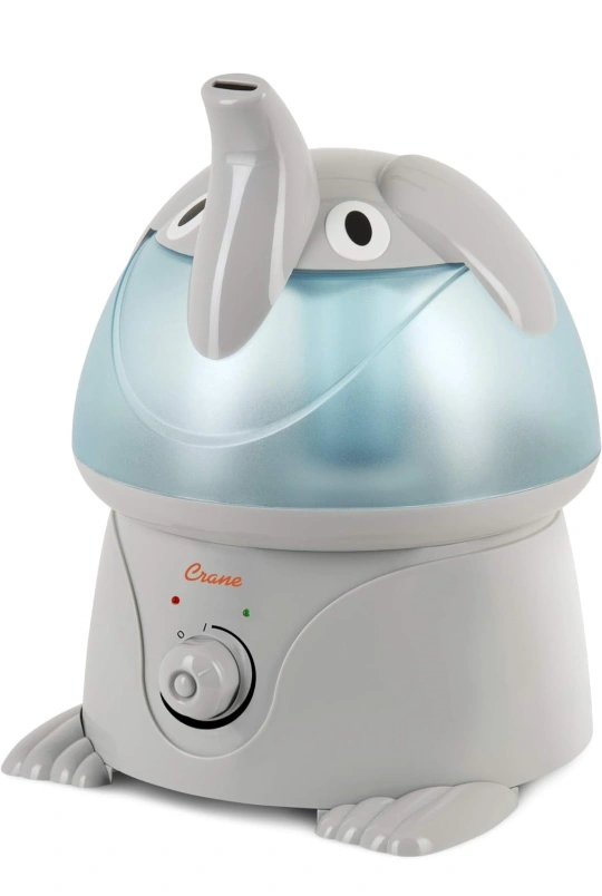 Adorable elephant ultrasonic cool mist humidifier with a large 1 gallon tank that runs up to 24 hours. Variable control allows you to adjust the mist output. Whisper quiet operation. Easy to clean. Safe for kids.